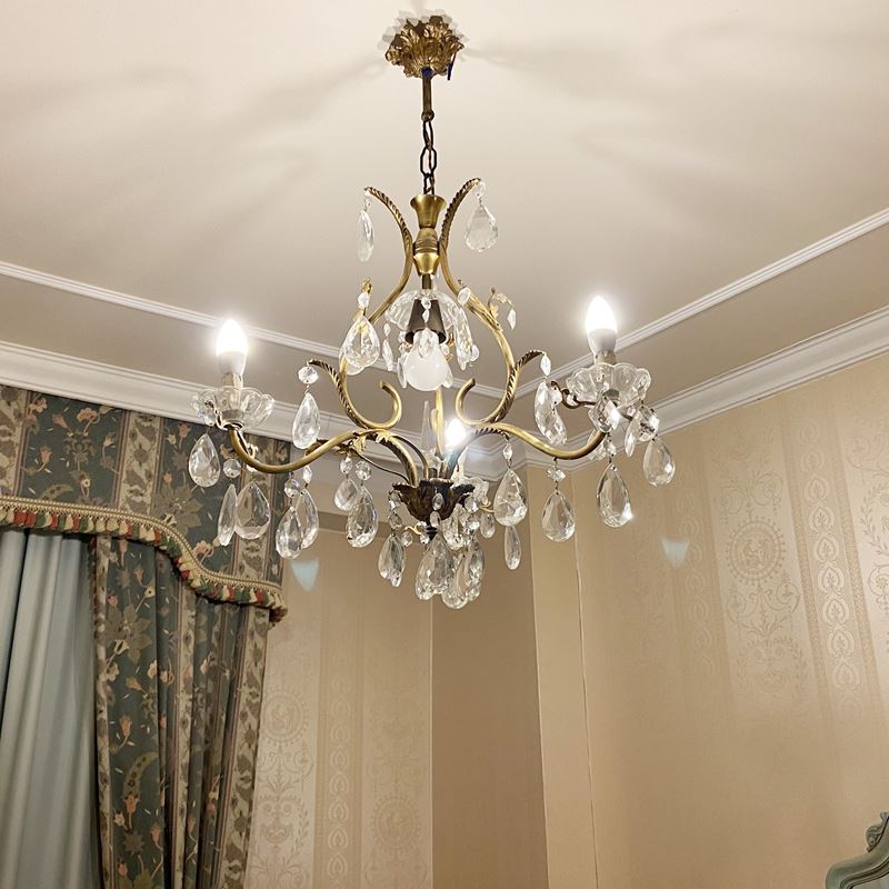 completa di: un letto a due piazze, testata con comandi, due abat-jour, due comodini, uno scrittoio con due sedie, una lampada in metallo verniciato e dorato, un mobile porta tv e frigobar, due specchiere, un poggia valigia, un attaccapanni con placche raffiguranti scene equestri, una lampadario in bronzo dorato a quattro luci con pendenti in vetro ed un tendaggio completo di misure: 295x220cm.