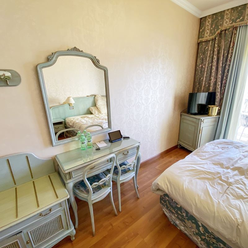 completa di: un letto a due piazze, testata con comandi, due abat-jour, due comodini, uno scrittoio con due sedie, un mobile porta tv e frigobar, due specchiere, un poggia valigia, una poltrona, un attaccapanni con placche raffiguranti scene equestri, una lampadario in bronzo dorato a quattro luci con pendenti in vetro ed un tendaggio completo di misure: 295x290cm.