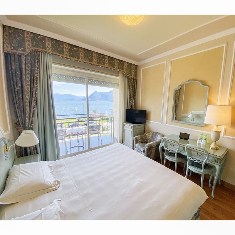 completa di: un letto a due piazze, testata con comandi, due abat-jour, due comodini, uno scrittoio con due sedie, una lampada in metallo verniciato e dorato, due specchiere, un mobile porta tv e frigobar, un poggia valigie, una poltrona, una plafoniera, un appendiabiti con placche in ottone, ed un tendaggio completo di misure 295x300 cm.