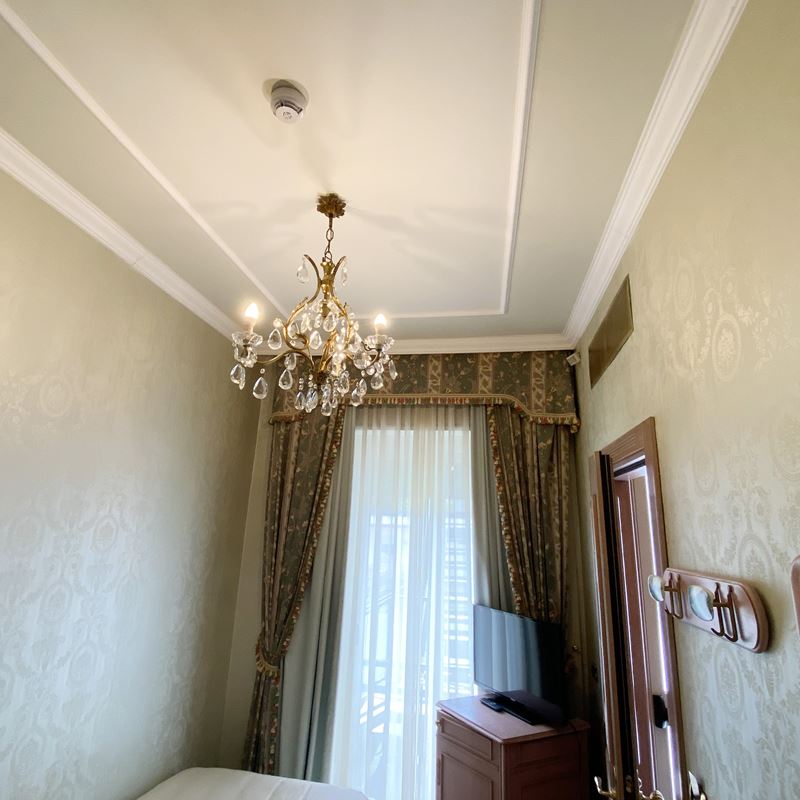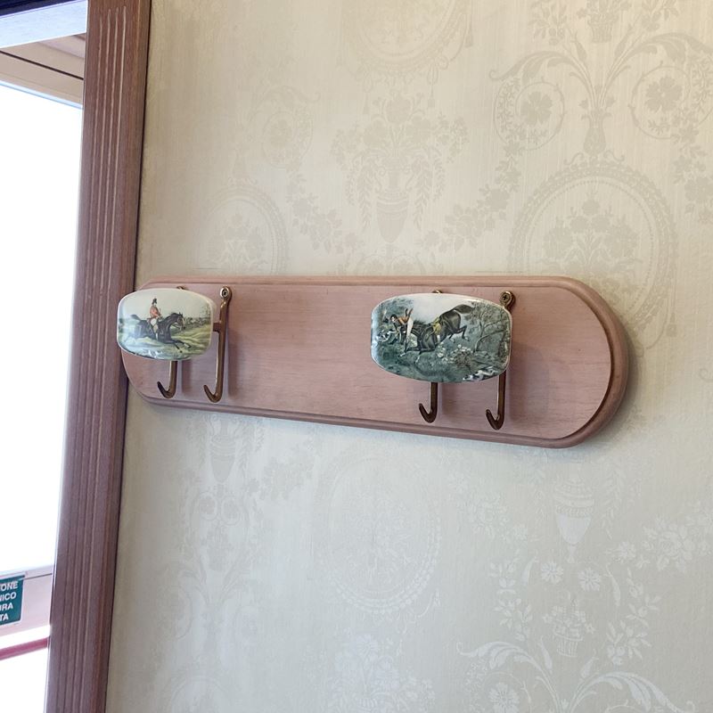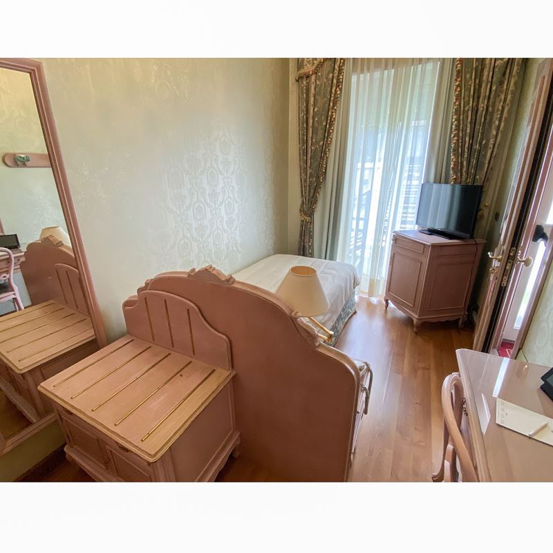 completa di: un letto singolo, una testata con comandi, un'abat-jour, un comodino, uno scrittorio con sedia, una lampada in metallo verniciato e dorato, due specchiere, un poggia valigie, un mobile porta tv e frigobar, un appendiabiti raffigurante scene equestri, un lampadario in bronzo dorato a quattro luci con pendenti in vetro e un tendaggio completo di misure: 300x190 cm.