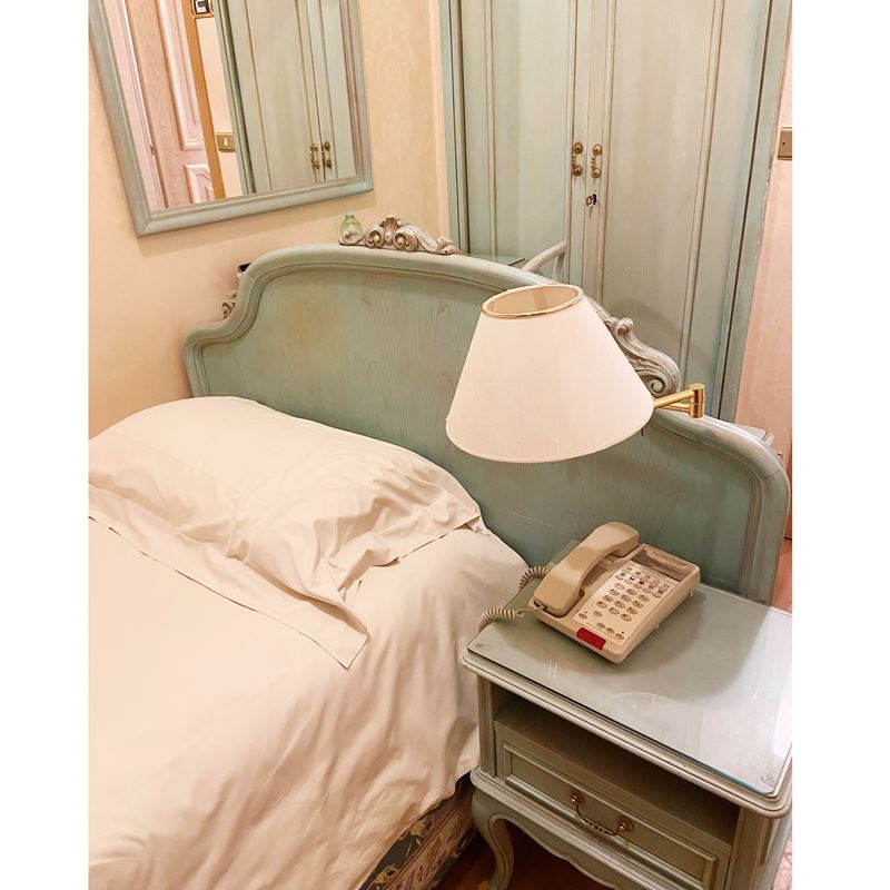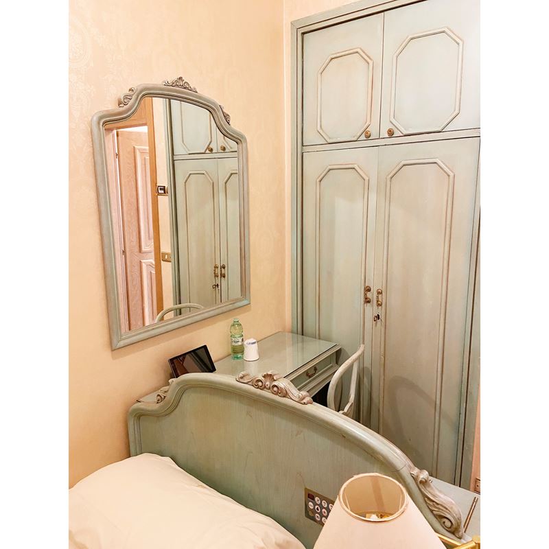 completa di: un letto ad una piazza, con abat-jour e comandi, due specchiere, uno scrittoio con sedia, un comodino, una lampada in metallo verniciato e dorato, un mobile poggiavaligie, un mobile porta tv e frigobar, un attaccapanni con placche raffiguranti scene equestri, un tendaggio completo di misure 295x200 cm.