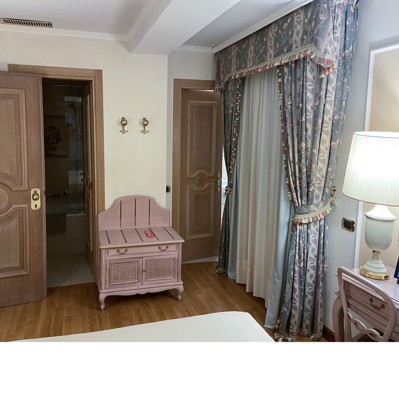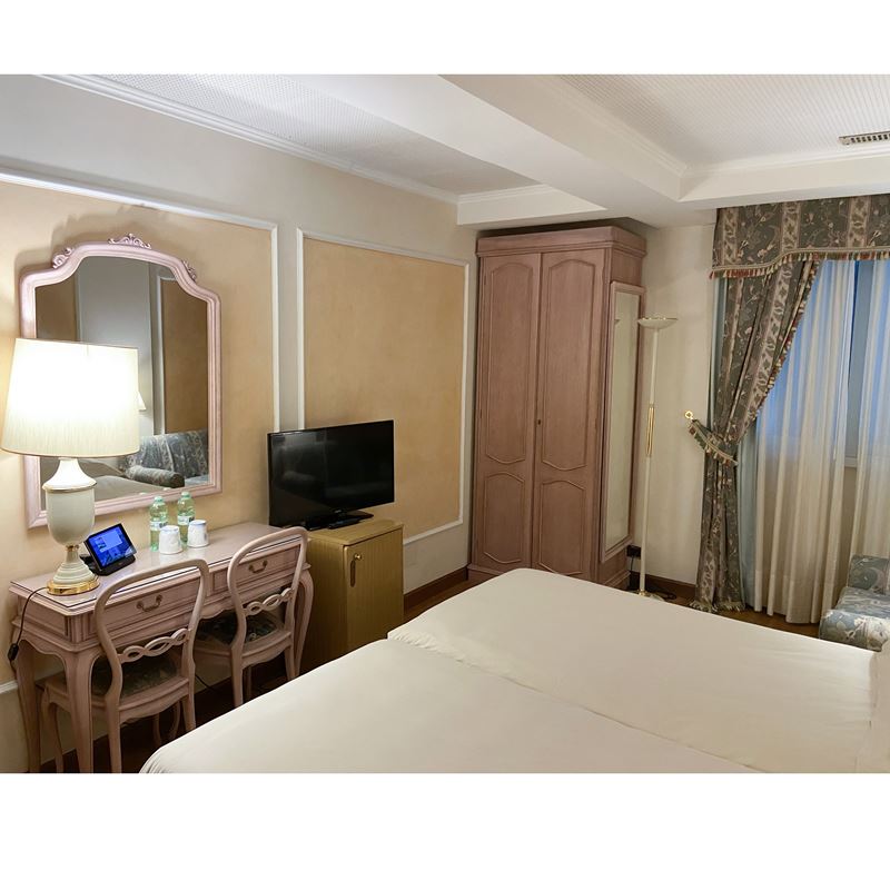 complete di: due letti singoli, una testata imbottita e rivestita in tessuto, un comodino, due abat-jour, uno scrittoio e due sedie, una lampada in metallo verniciato e dorato, due specchiere, una piantana alogena in metallo verniciato e dorato, un armadio a due ante, un mobile porta tv e frigobar, un poggia valigie, due appendiabiti in ottone, un divano-letto e due tendaggi completi di misure diverse. La descrizione è puramente indicativa, gli arredi possono cambiare in base alla composizione e le misure della camera.