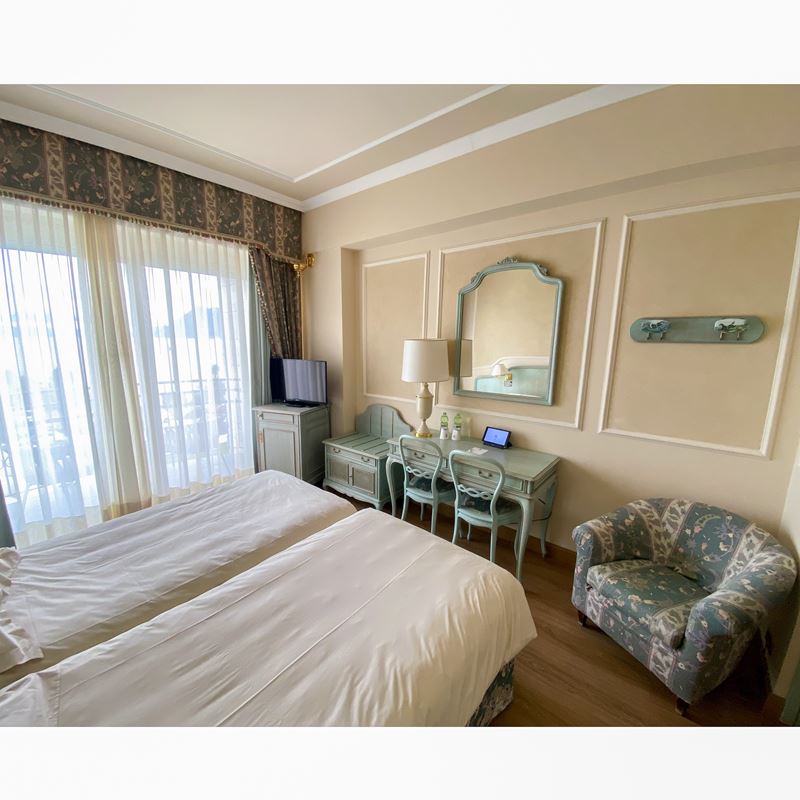 complete di: due letti ad una piazza, una testata con comandi, due abat-jour, due comodini, uno scrittoio con due sedie, una lampada in metallo verniciato e dorato, due specchiere, un mobile porta tv e frigobar, un poggia valigie, una poltrona, un appendiabiti con placche raffiguranti scene equestri, un'applique ed un tendaggio completo di misure diverse. La descrizione è puramente indicativa, gli arredi possono cambiare in base alla composizione e le misure della camera.