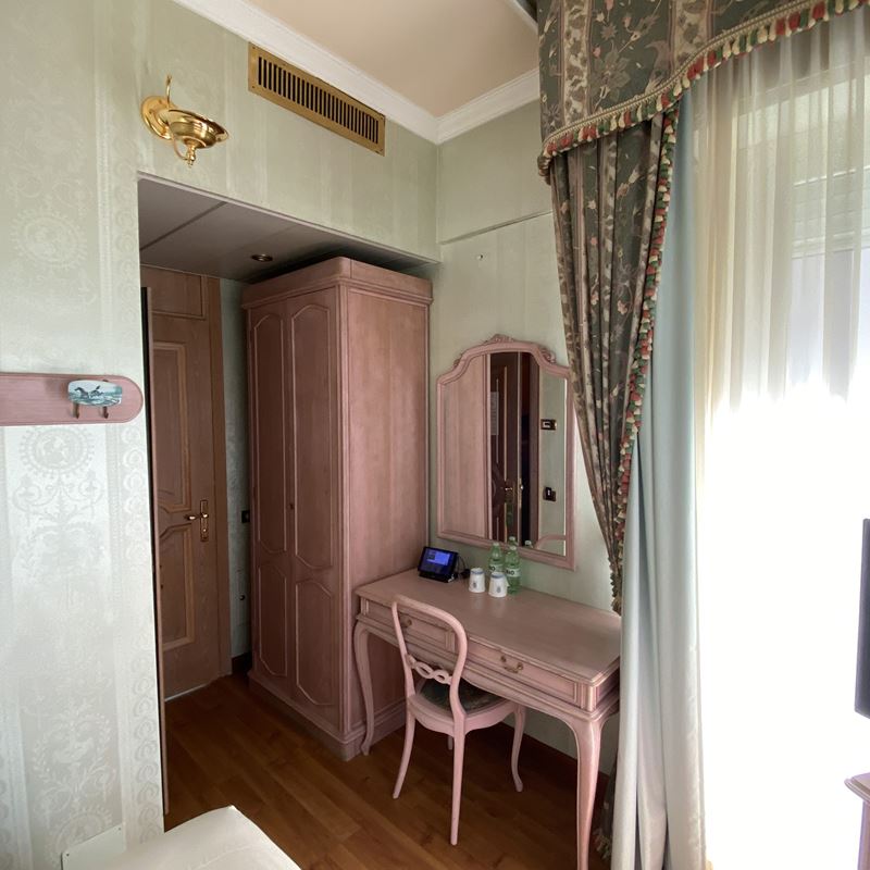 complete di: letto a due piazze, una testata con comandi, due abat-jour, due comodini, uno scrittoio con una sedia, due specchiere, un mobile porta tv e frigobar, un attaccapanni raffigurante scene equestri, un armadio a due ante, un'appliques in metallo dorato ed un tendaggio completo angolare di misure diverse. La descrizione è puramente indicativa, gli arredi possono cambiare in base alla composizione e le misure della camera.
