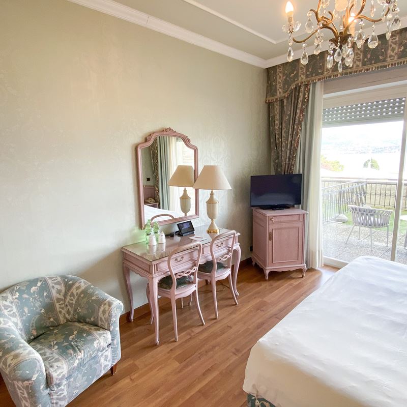 complete di: un letto a due piazze, una testata con comandi, due abat-jour, due comodini, uno scrittoio con due sedie, una lampada in metallo verniciato e dorato, due specchiere, un mobile porta tv e frigobar, un poggiavaligie, un appendiabiti con placche raffiguranti scene equestri, due poltrone, un lampadario in bronzo dorato a quattro luci con pendenti in vetro ed un tendaggio completo di misure diverse. La descrizione è puramente indicativa, gli arredi possono cambiare in base alla composizione e le misure della camera.