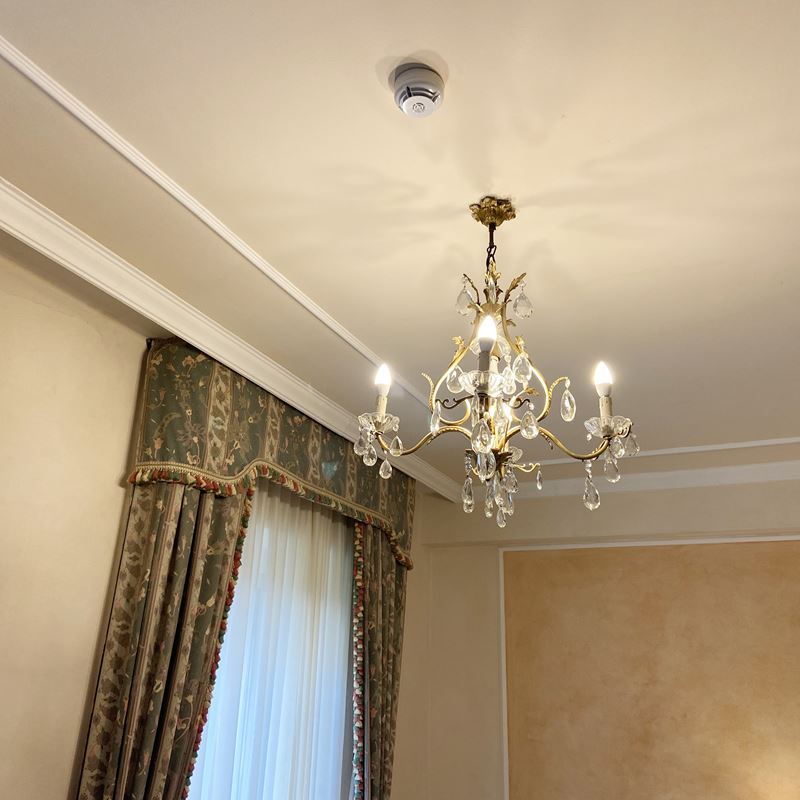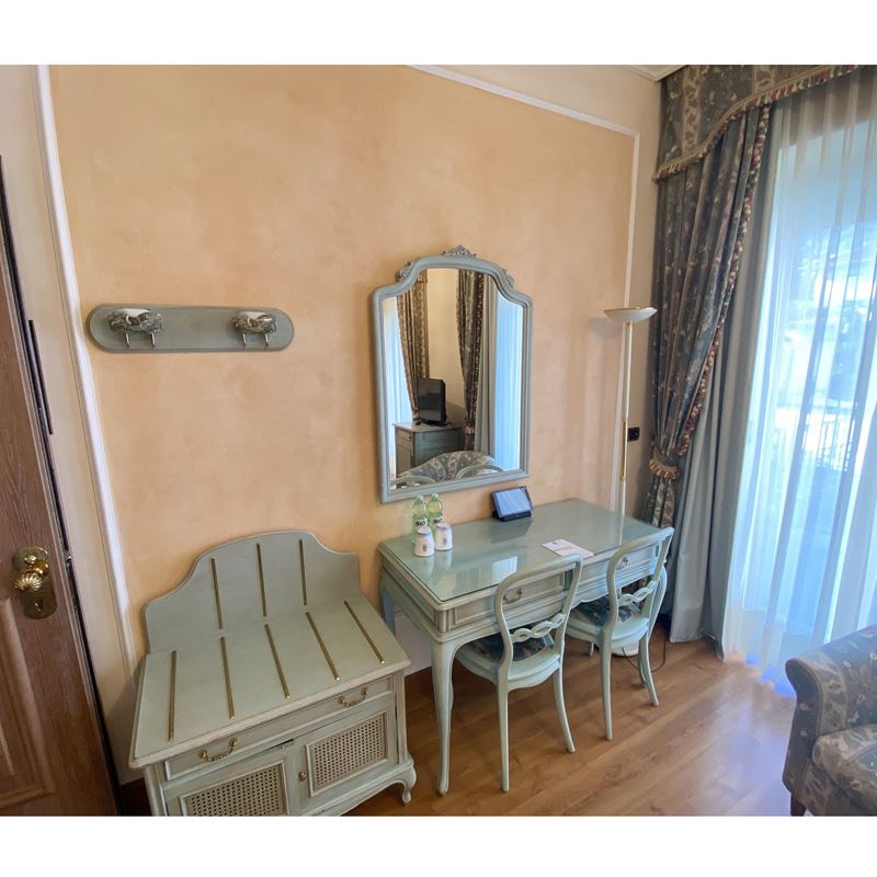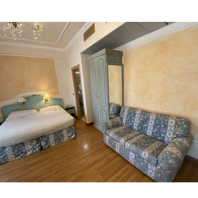 complete di: un letto a due piazze, una testata con comandi, due abat-jour, due comodini, uno scrittoio con due sedie, due specchiere, un poggia valigie, un mobile porta tv e frigobar, un divano-letto, una poltrona, un armadio a due ante, una piantana in metallo verniciato e dorato, un appendiabiti con placche raffiguranti scene equestri, un lampadario in bronzo dorato a cinque luci con pendenti in vetro, due tendaggi completi di misure diverse. La descrizione è puramente indicativa, gli arredi possono cambiare in base alla composizione e le misure della camera.