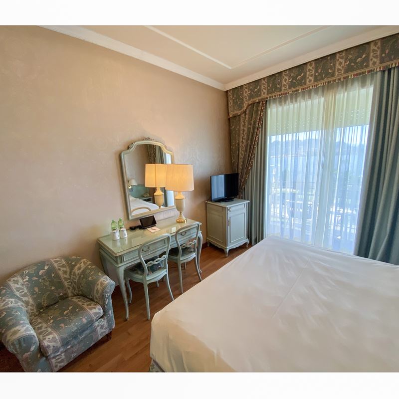 complete di: un letto a due piazze, testata con comandi, due abat-jour, due comodini, uno scrittoio con due sedie, una lampada in metallo verniciato e dorato, un mobile porta tv e frigobar, due specchiere, una poltrona, un poggia valigia, un attaccapanni con placche raffiguranti scene equestri, una plafoniera ed un tendaggio completo di misure diverse. La descrizione è puramente indicativa, gli arredi possono cambiare in base alla composizione e le misure della camera.