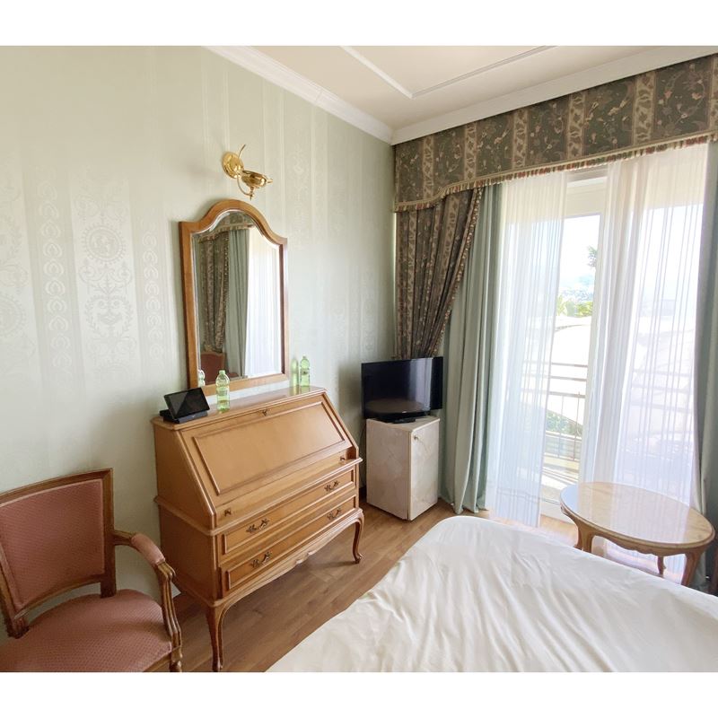 complete di: due letti ad una piazza , una testata, due abat-jour, un mobile a ribalta, due specchiere, un mobile porta tv e frigobar, un poggia valigie, due poltrone, un tavolino tondo, un appendiabiti con placche in ottone, un'applique in metallo dorato, ed un tendaggio completo di misure diverse. La descrizione è puramente indicativa, gli arredi possono cambiare in base alla composizione e le misure della camera.