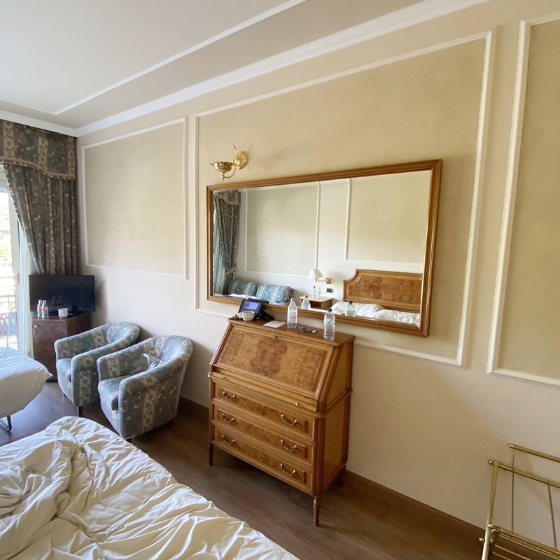 completa di: due letti ad una piazza , una testata, due abat-jour, due comodini, una ribalta, due specchiere, un mobile porta tv e frigobar, un poggia valigie, due poltrone, un armadio a quattro ante, un divano-letto, un'applique in metallo dorato, ed un tendaggio completo di misure diverse. La descrizione è puramente indicativa, gli arredi possono cambiare in base alla composizione e le misure della camera.