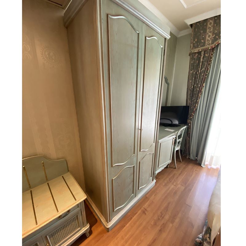 complete di: due letti a una piazza, testata con comandi, due abat-jour, due comodini, uno scrittoio con frigobar ed una sedia, una lampada in metallo verniciato e dorato, due specchiere, un armadio a due ante, un appendiabiti con placche in ottone, un applique in metallo dorato ed un tendaggio completo di misure diverse. La descrizione è puramente indicativa, gli arredi possono cambiare in base alla composizione e le misure della camera.