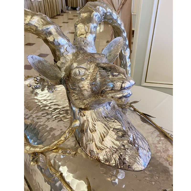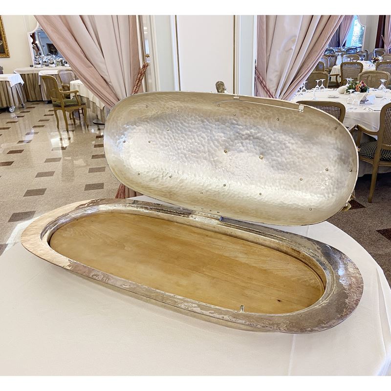 in metallo argentato, coperchio bombato centrato da una testa di Capriolo