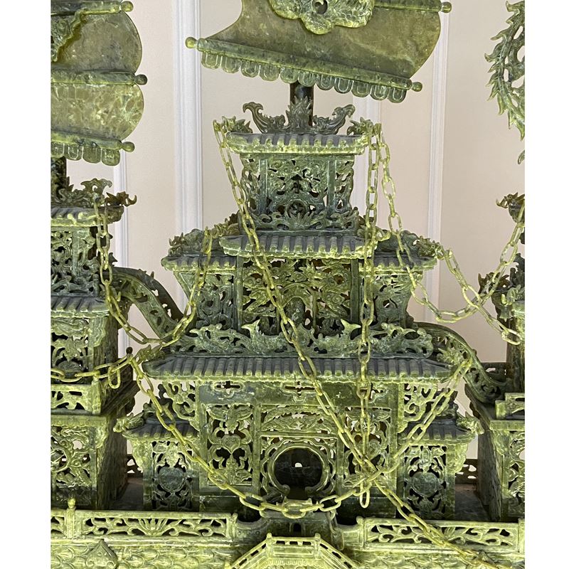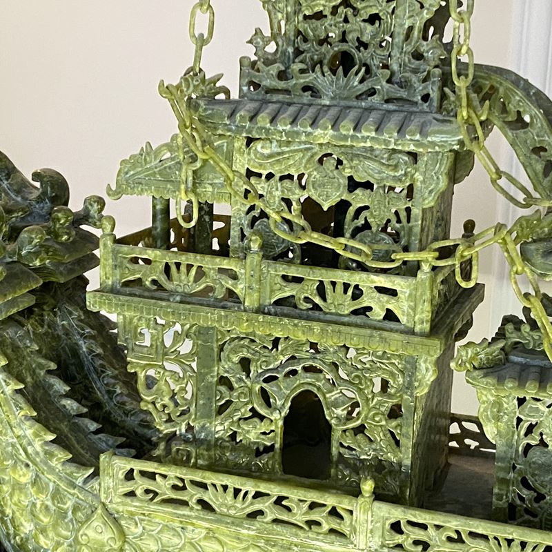 corpo traforato e scolpito con motivi orientali e dragoni, poggiante su base in legno cesellato con motivi vegetali, difetti e mancanze.
