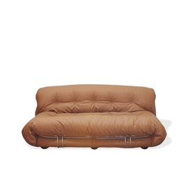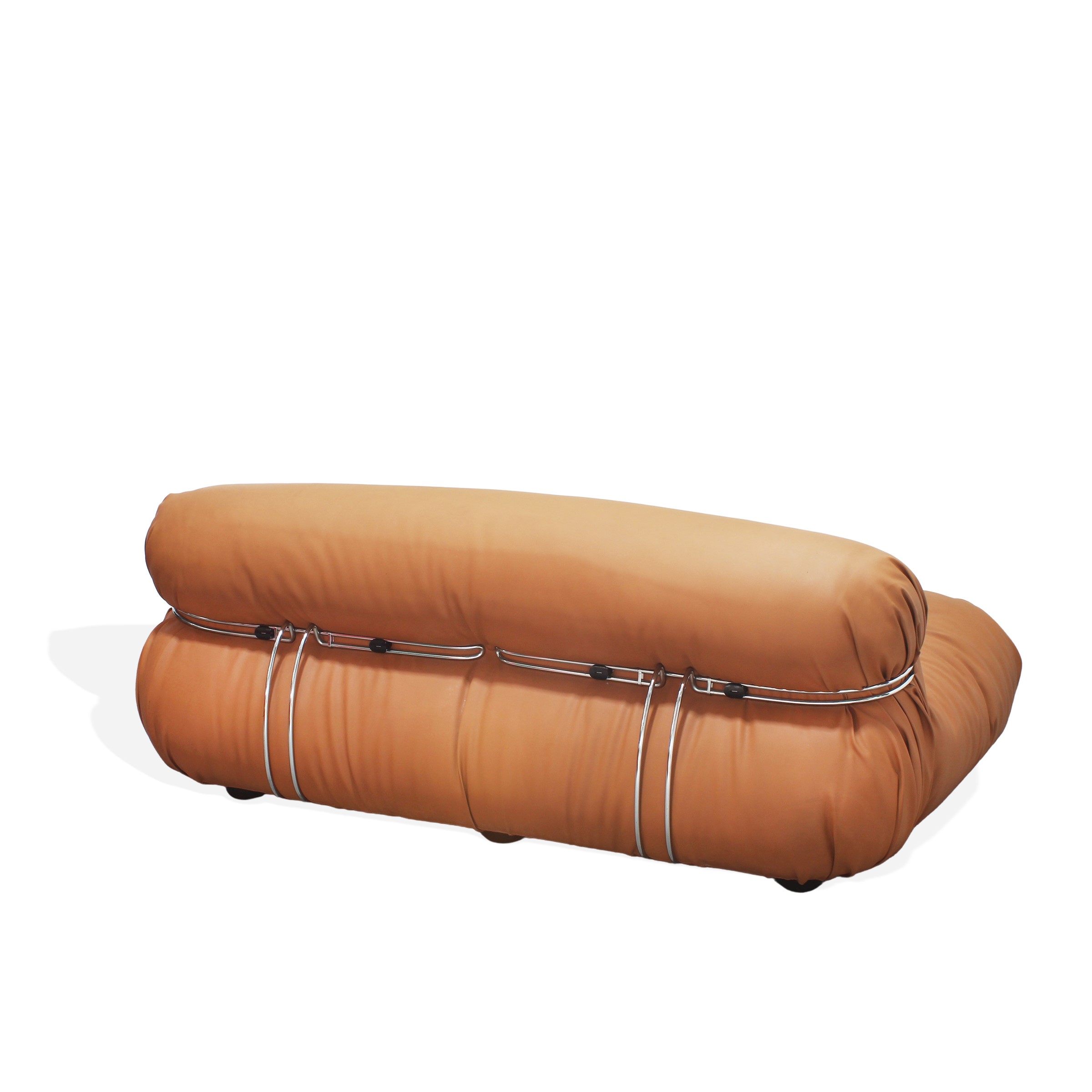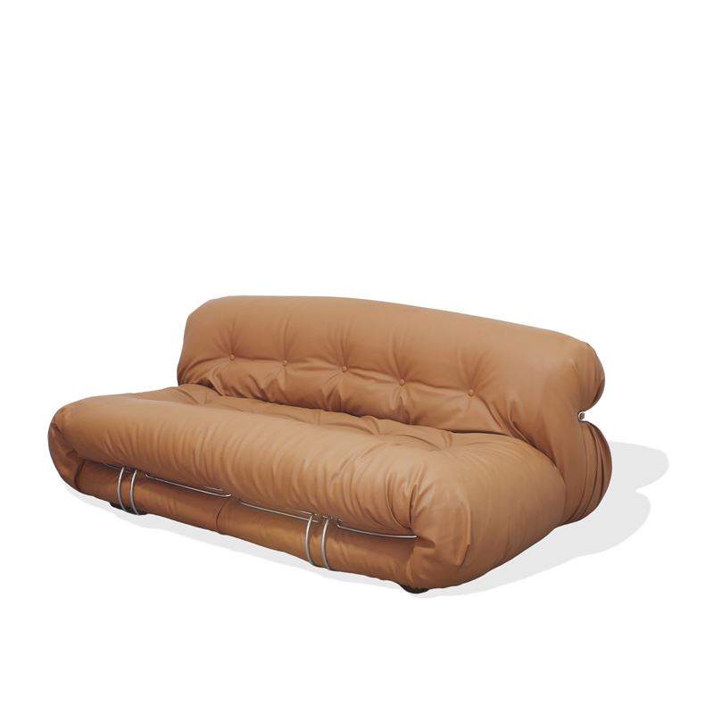 divano mod "Soriana" con struttura in tubolare cromato e rivestimenti in ecopelle, etichetta della produzione