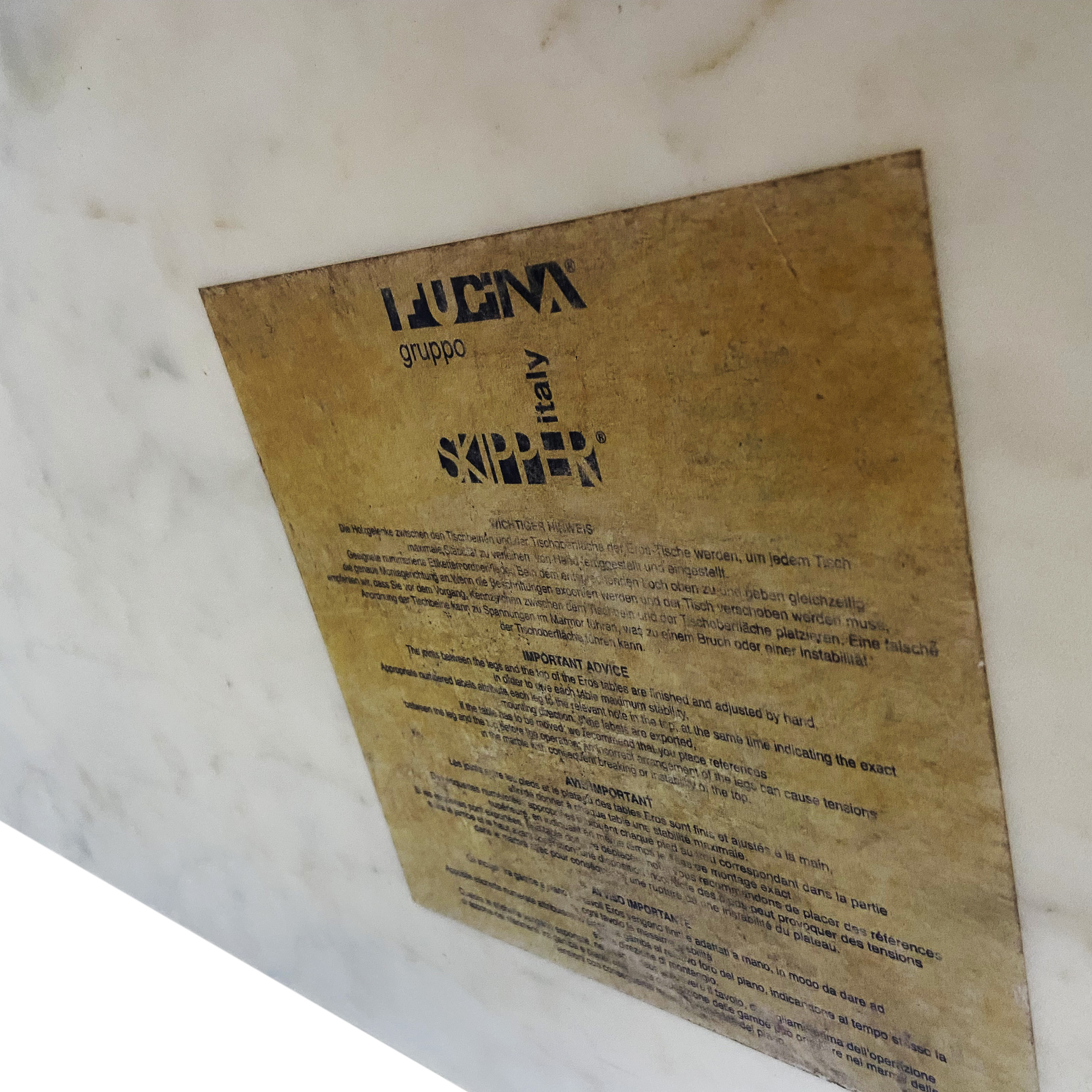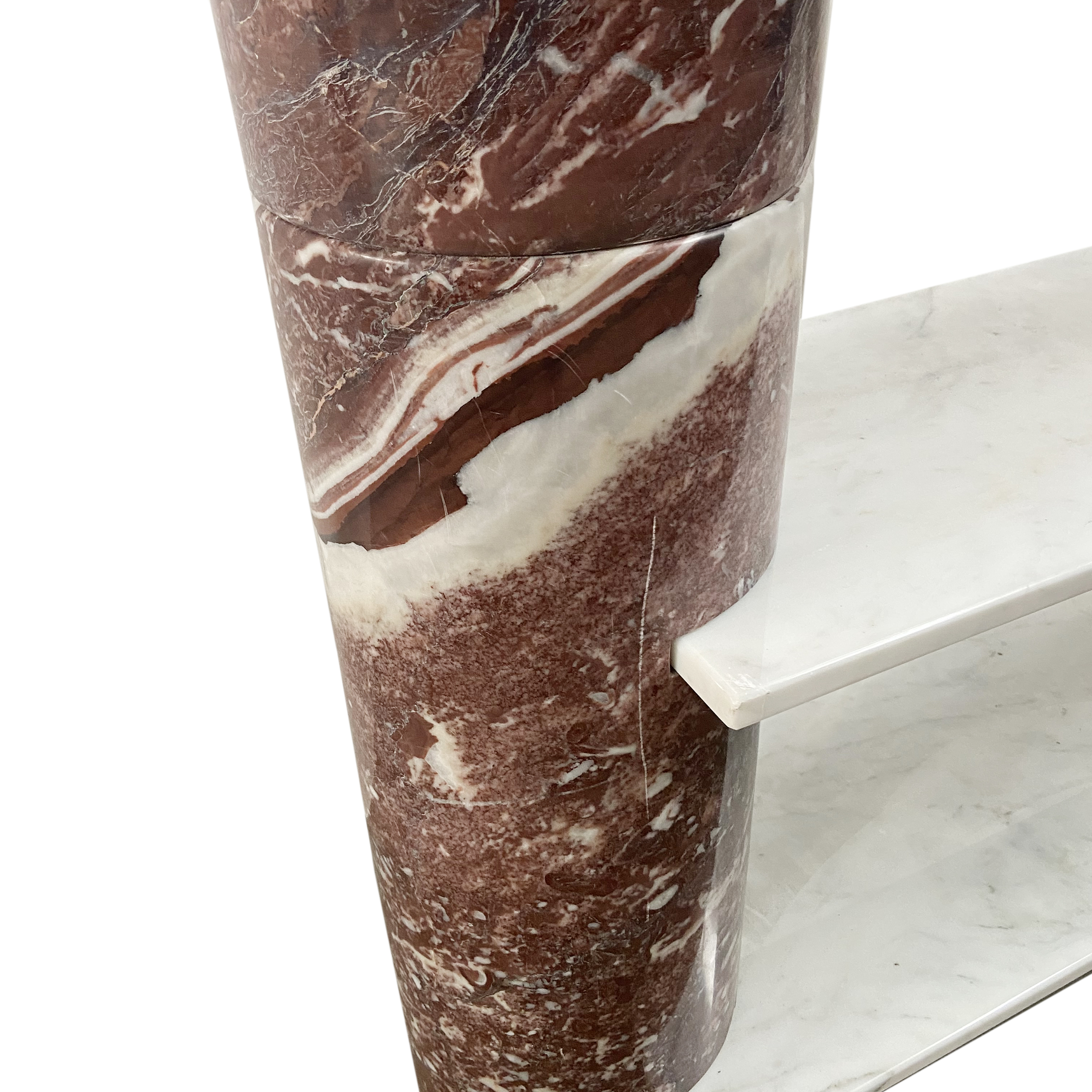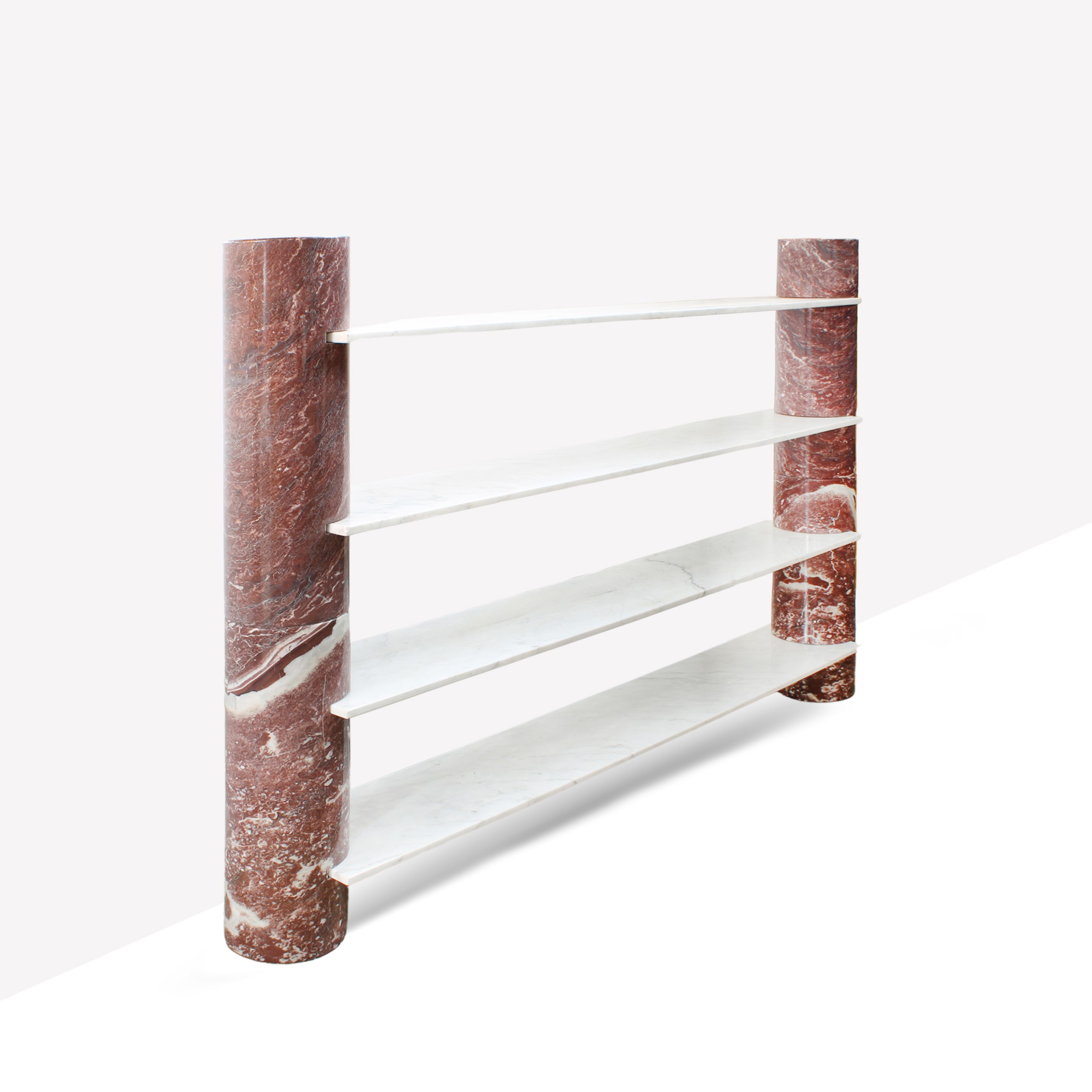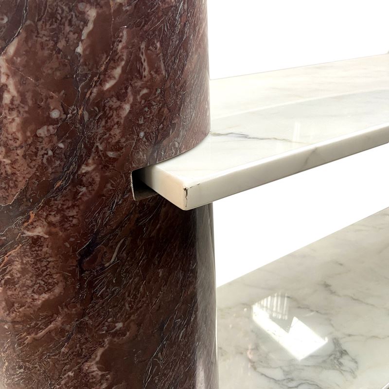 libreria mod. Loico, colonne in marmo rosso, ripiani in marmo bianco, etichetta della produzione