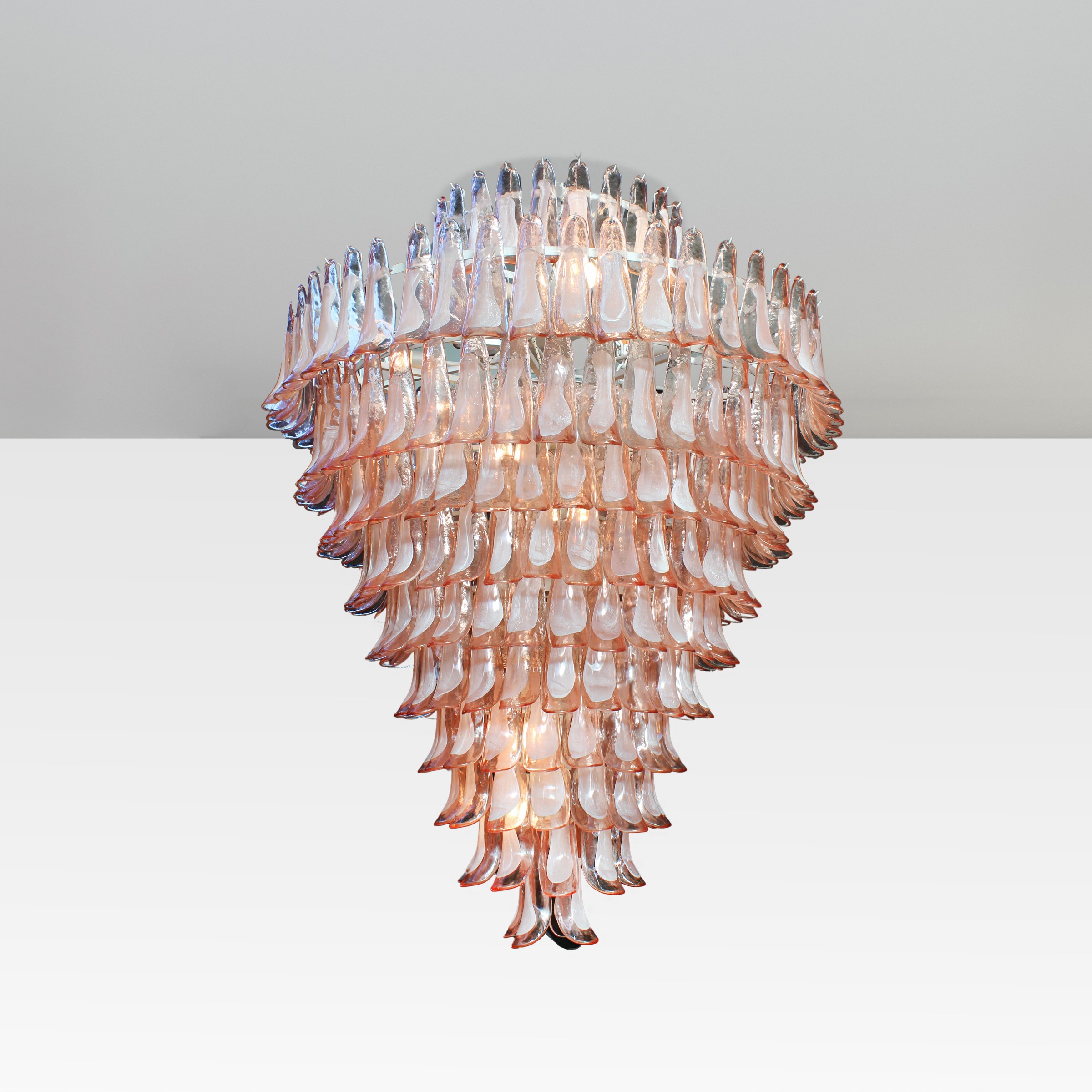 lampada a sospensione, in vetro rosa a macchia bianca, struttura in metallo verniciato.