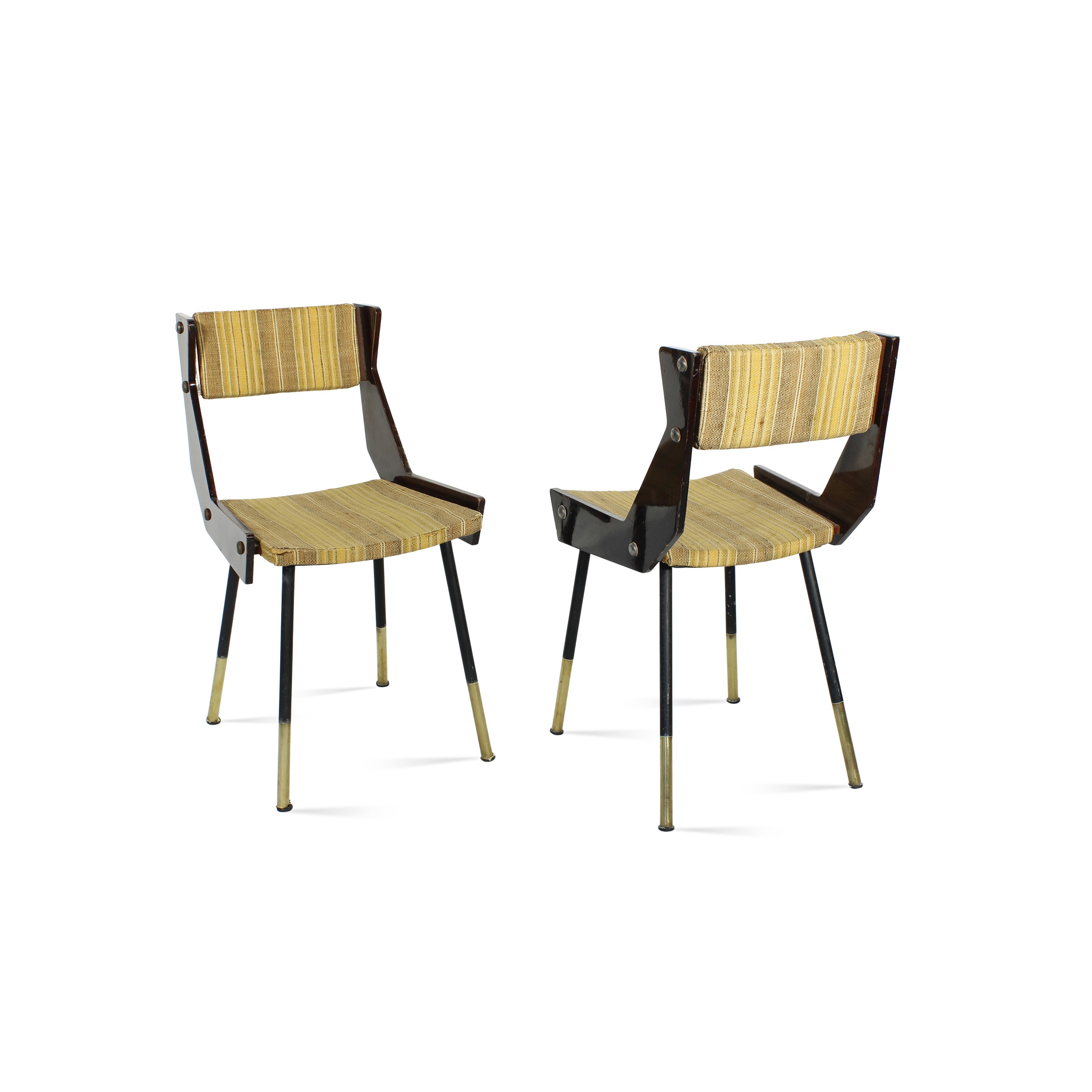 sei sedie in legno di mogano, supporti dei cuscini e terminali in ottone, gambe in metallo, sedute e schienali rivestite in tessuto, difetti