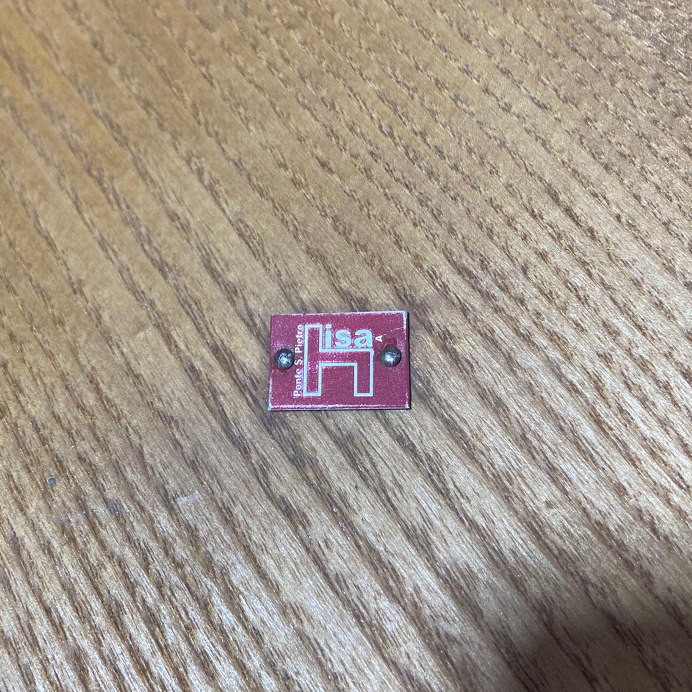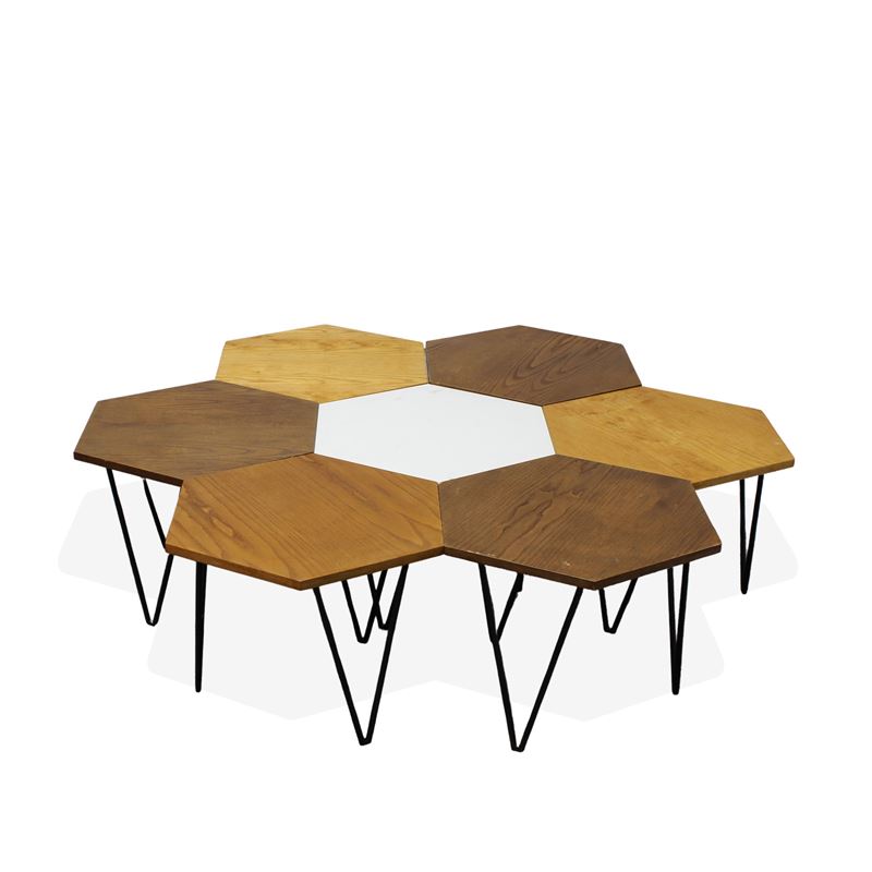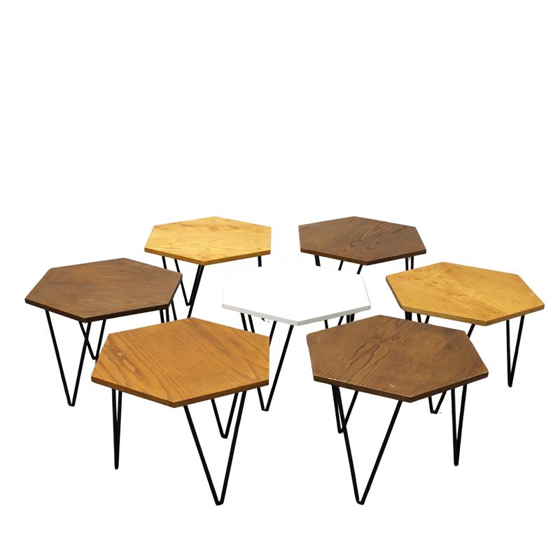 set di tavolini modulari, legno laccato e metallo verniciato, etichette in metallo della produzione