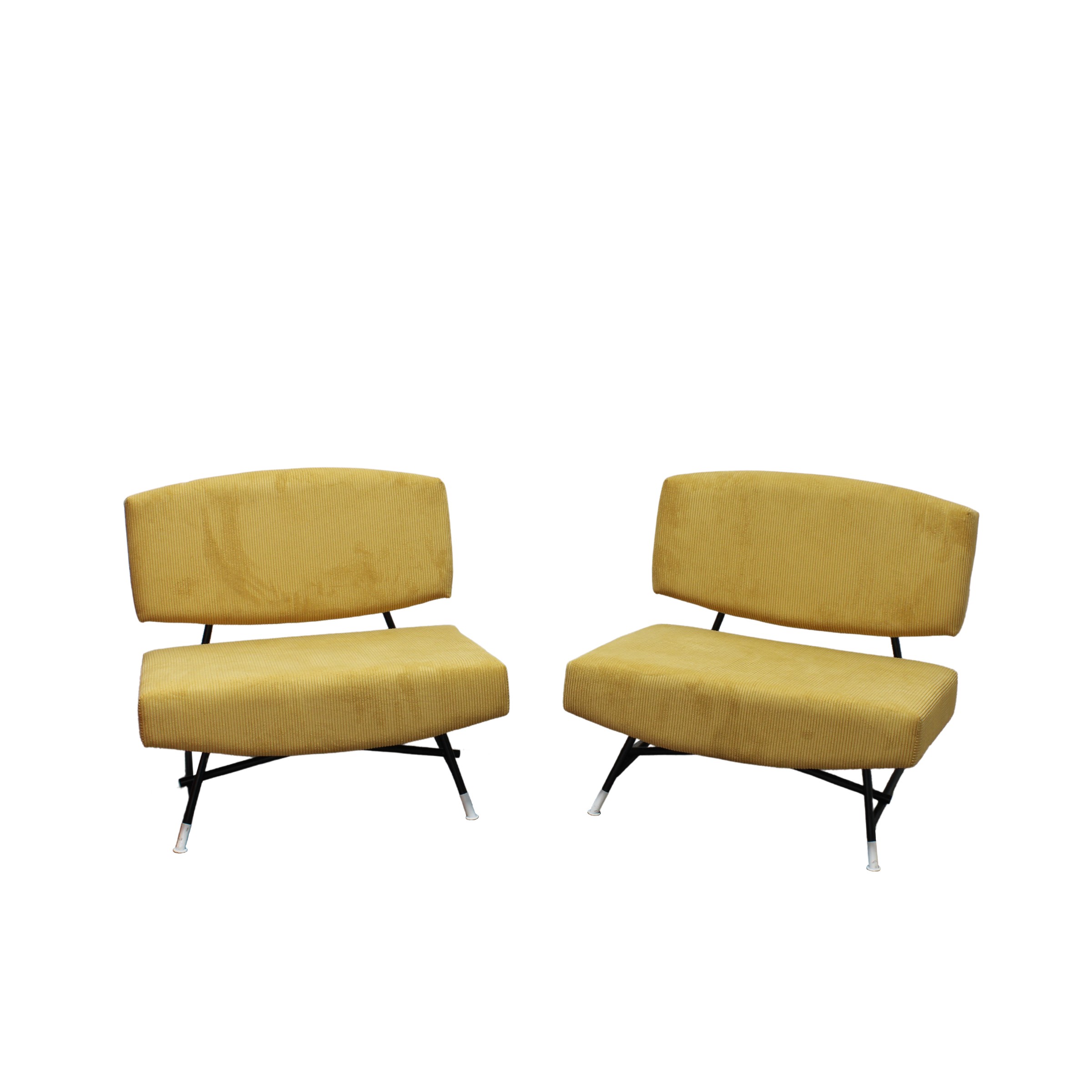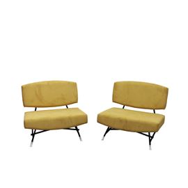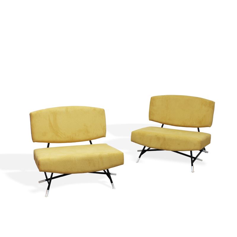 due poltrone mod "865", struttura in tubolare in metalllo verniciato nero e terminali in ottone verniciato bianco, sedute e schienali in tessuto.