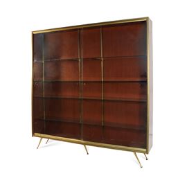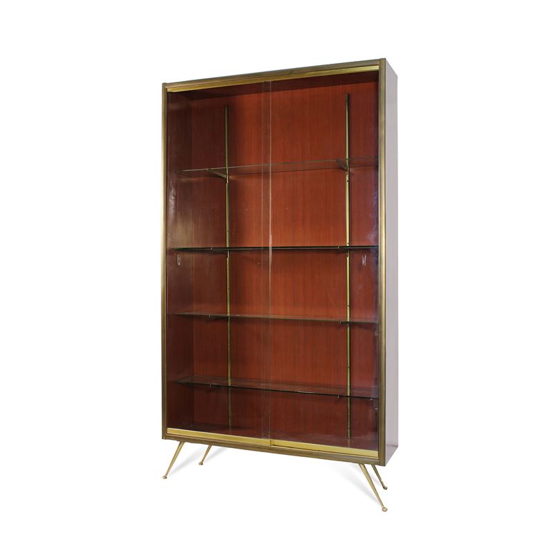 due vetrine in ottone e masonite tinta mogano, lievi difetti