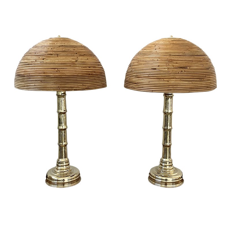 coppia di lampade da tavolo, strutture in ottone, paralumi in bamboo