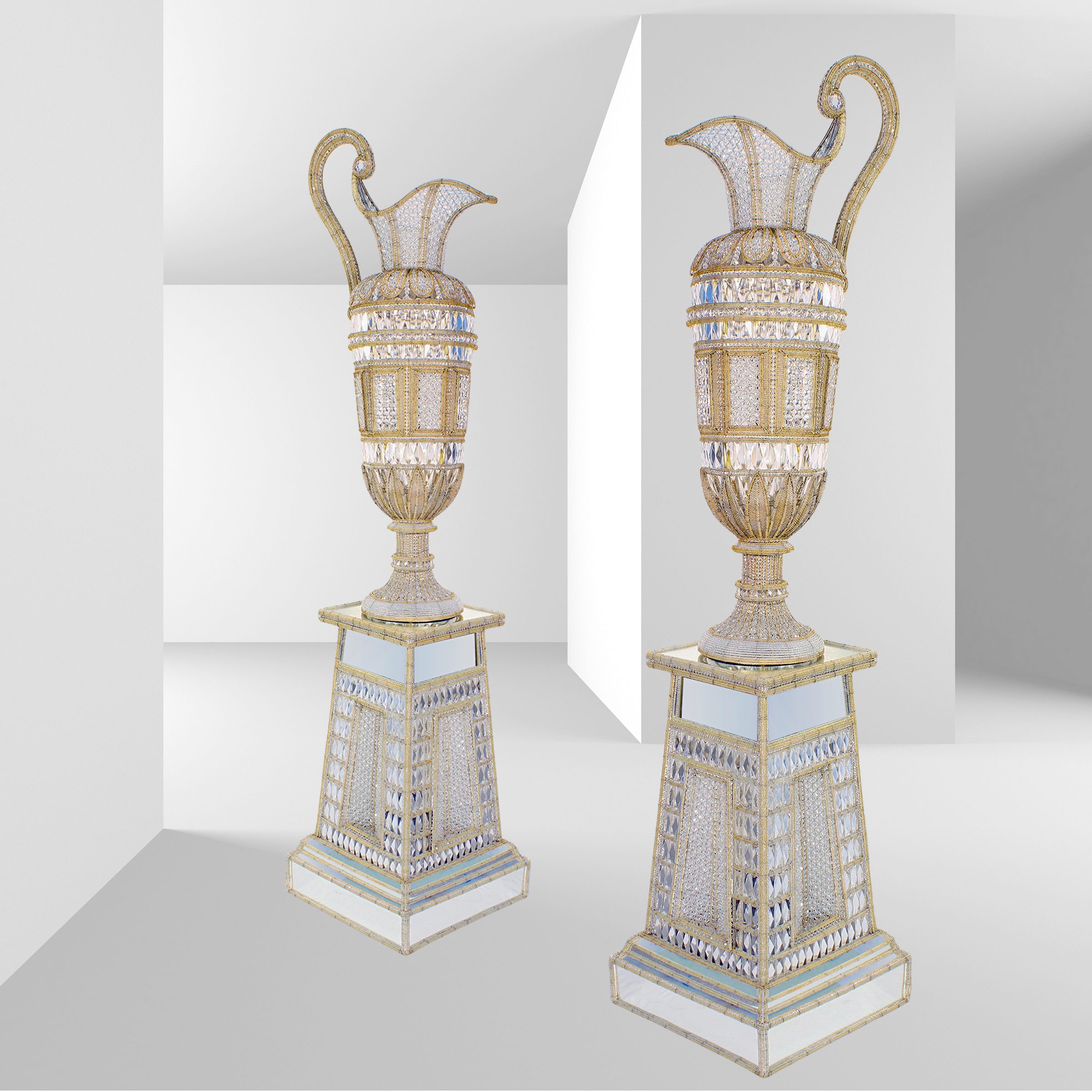 coppia di grandi anfore elettrificate, poggianti su basi a plinto, corpi realizzati in metallo e decorati con vetri e perline di vetro