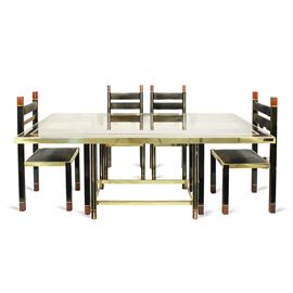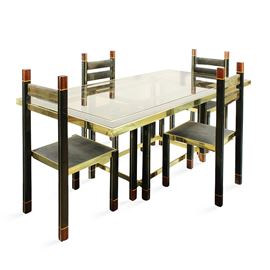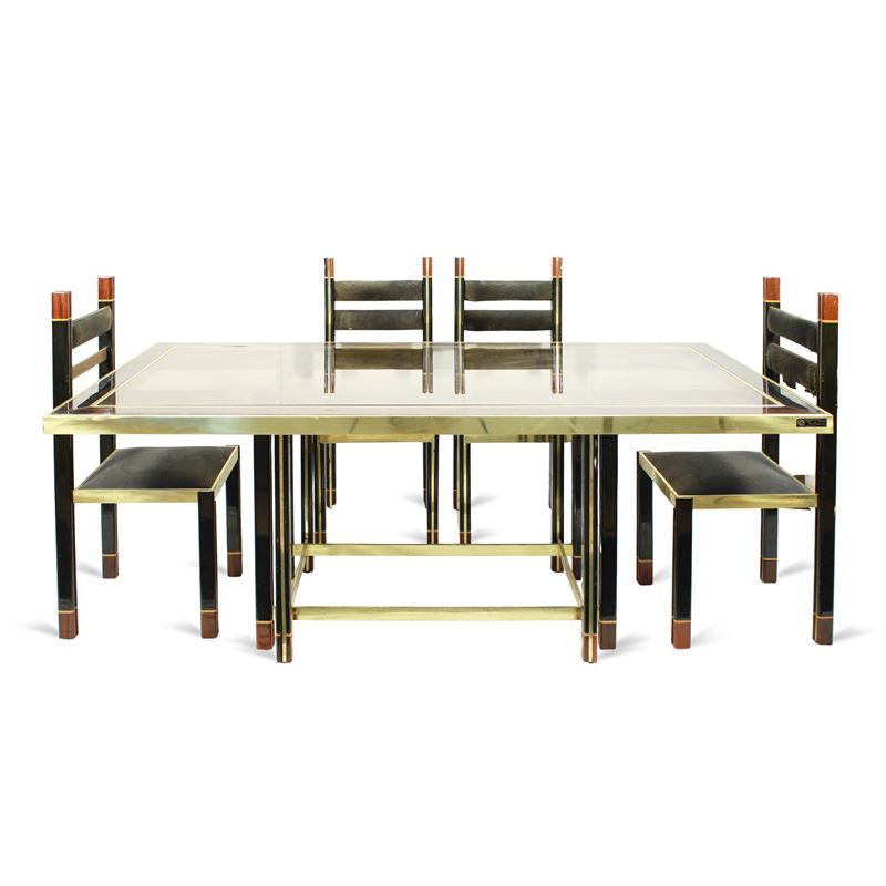tavolo da pranzo in legno, ottone e vetro, completo di quattro sedie, difetti