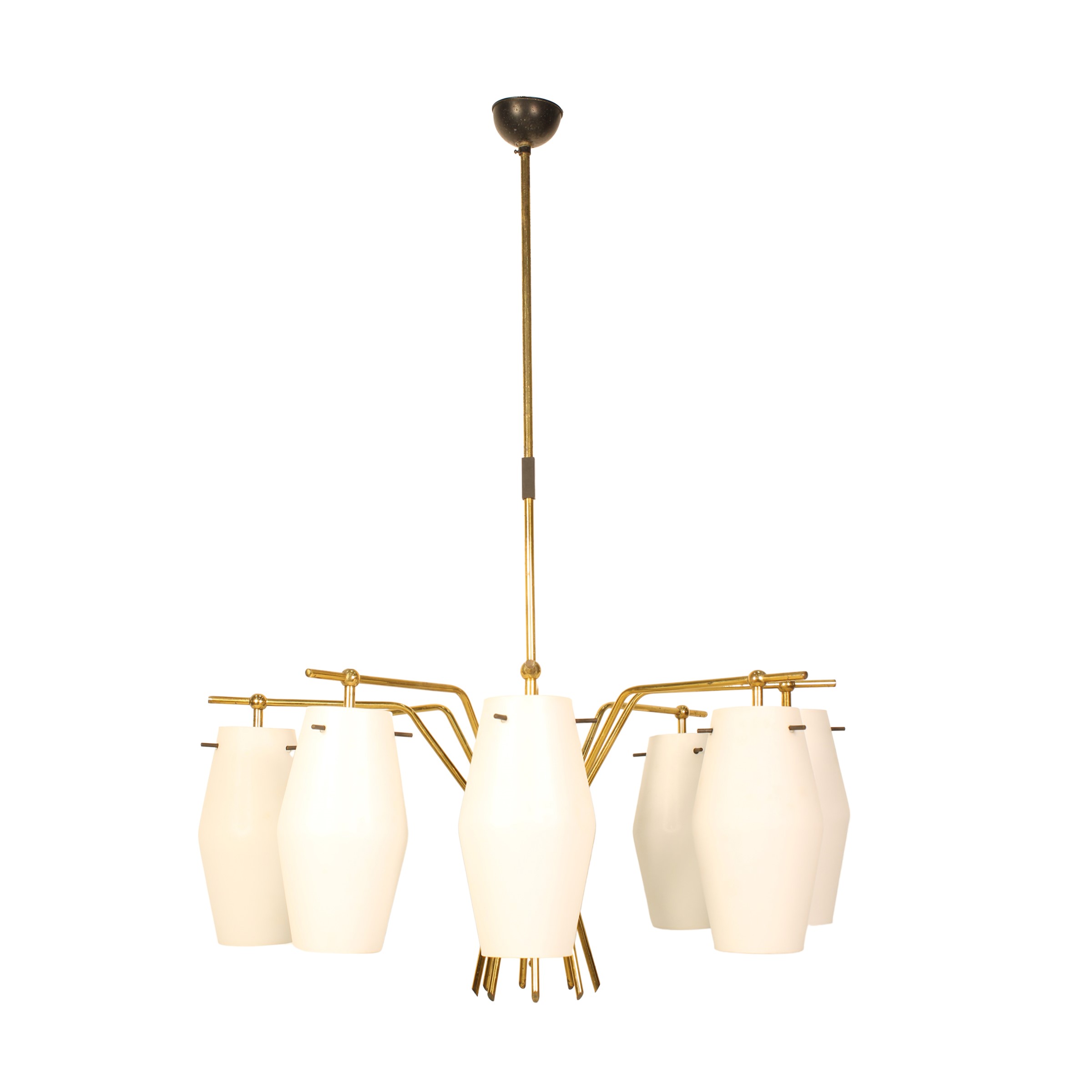 lampada a sospensione a otto luci in metallo e vetro opalino