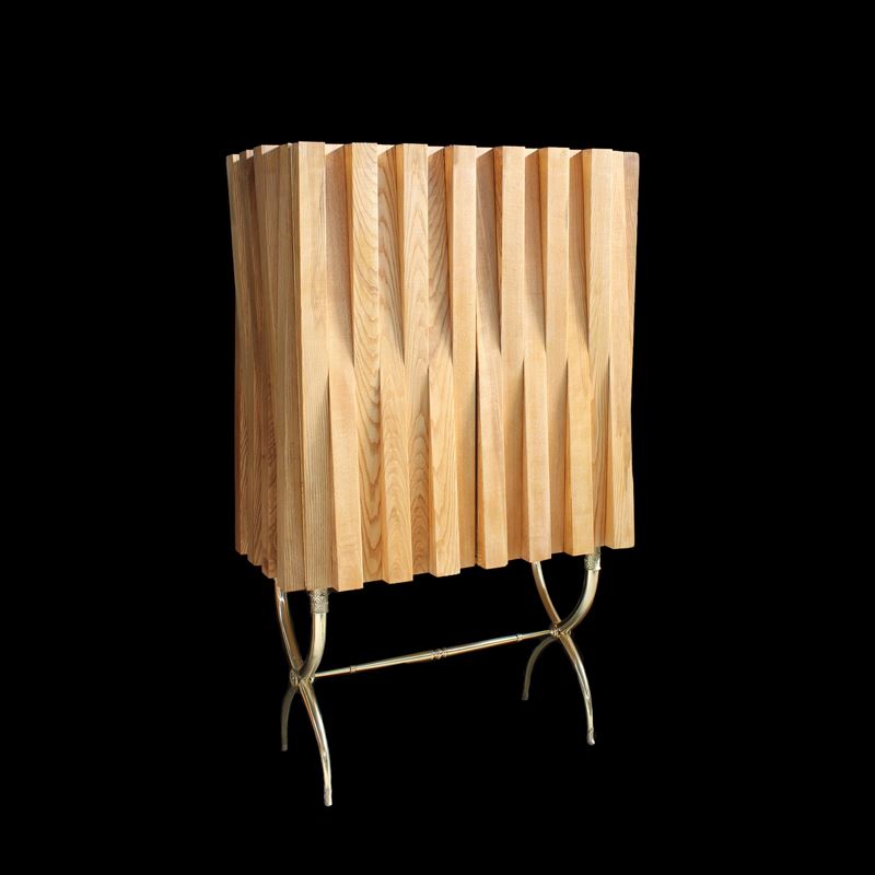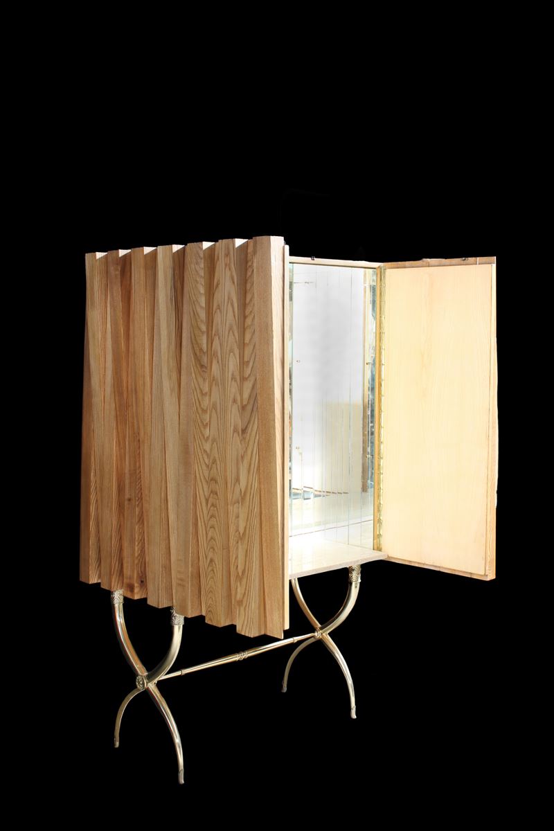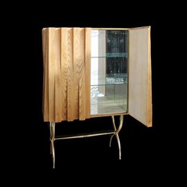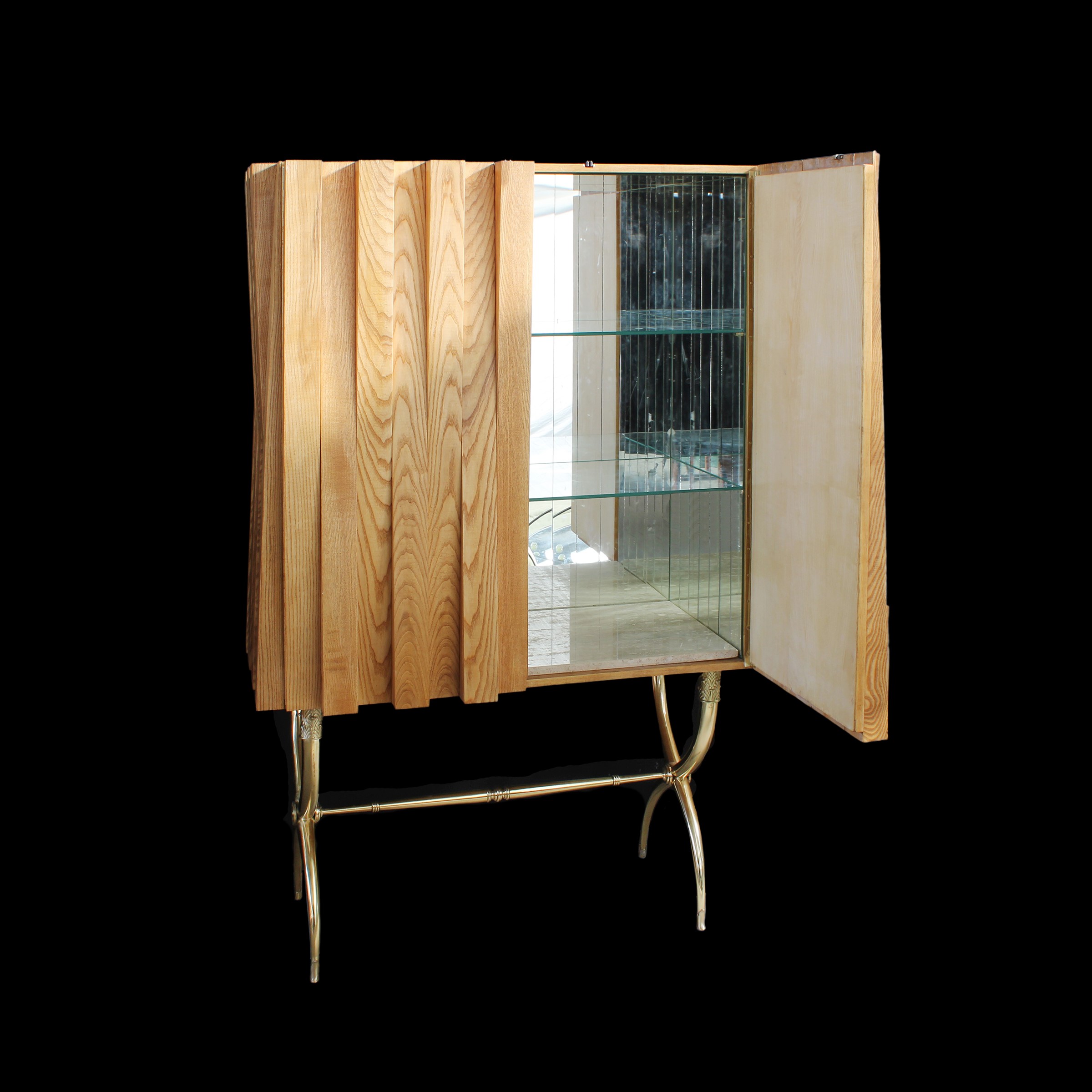 mobile bar in legno di frassino e ottone, interni in specchio e marmo
