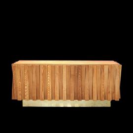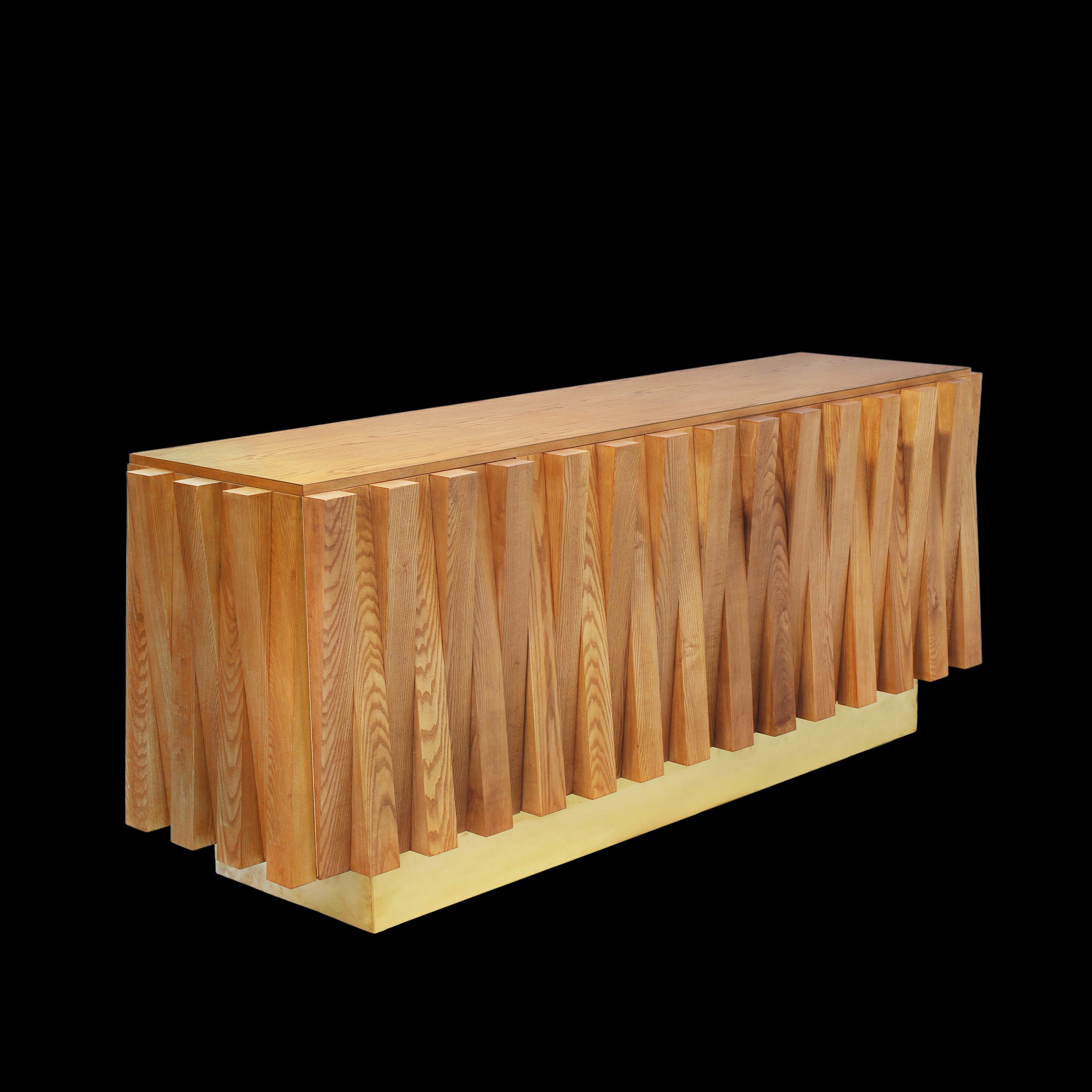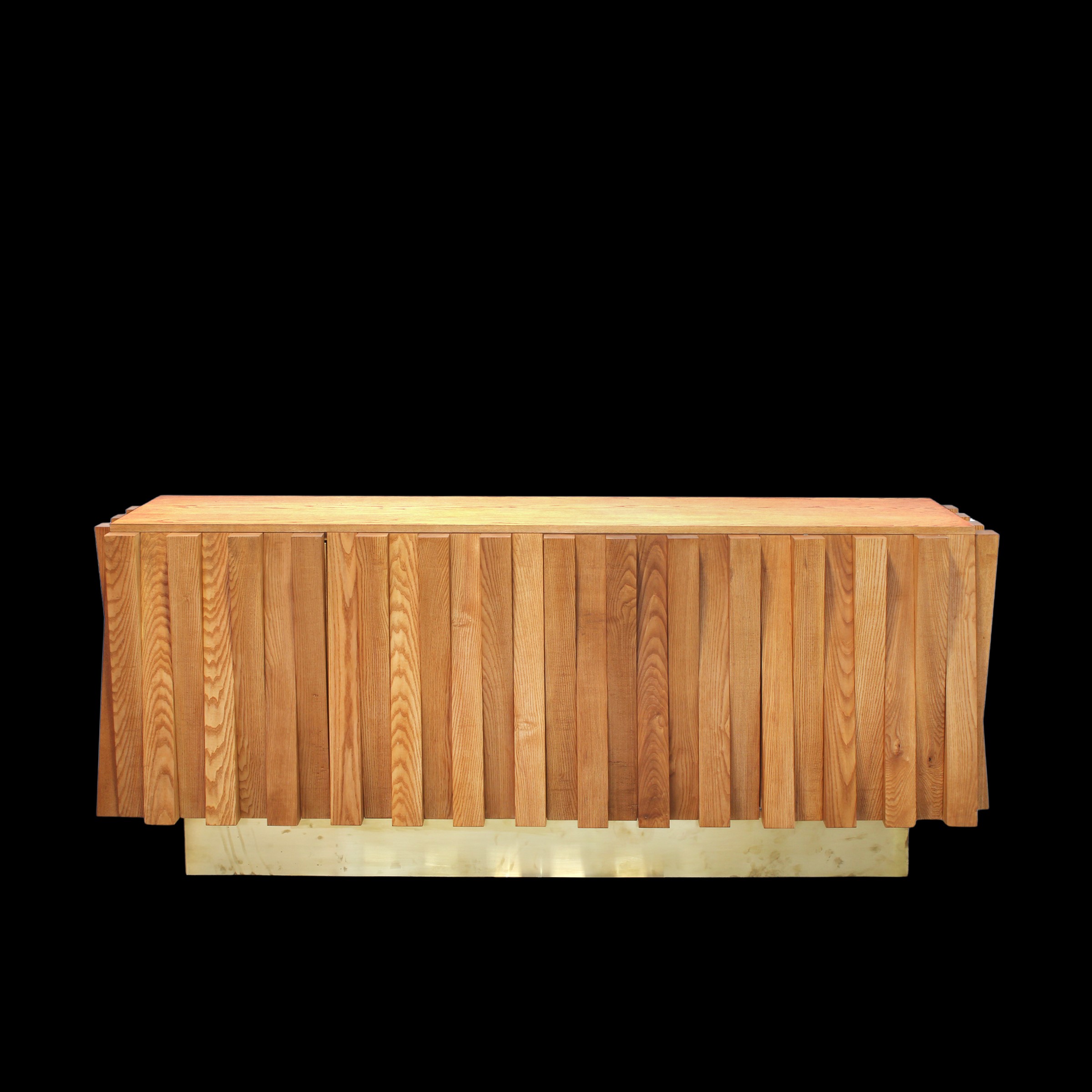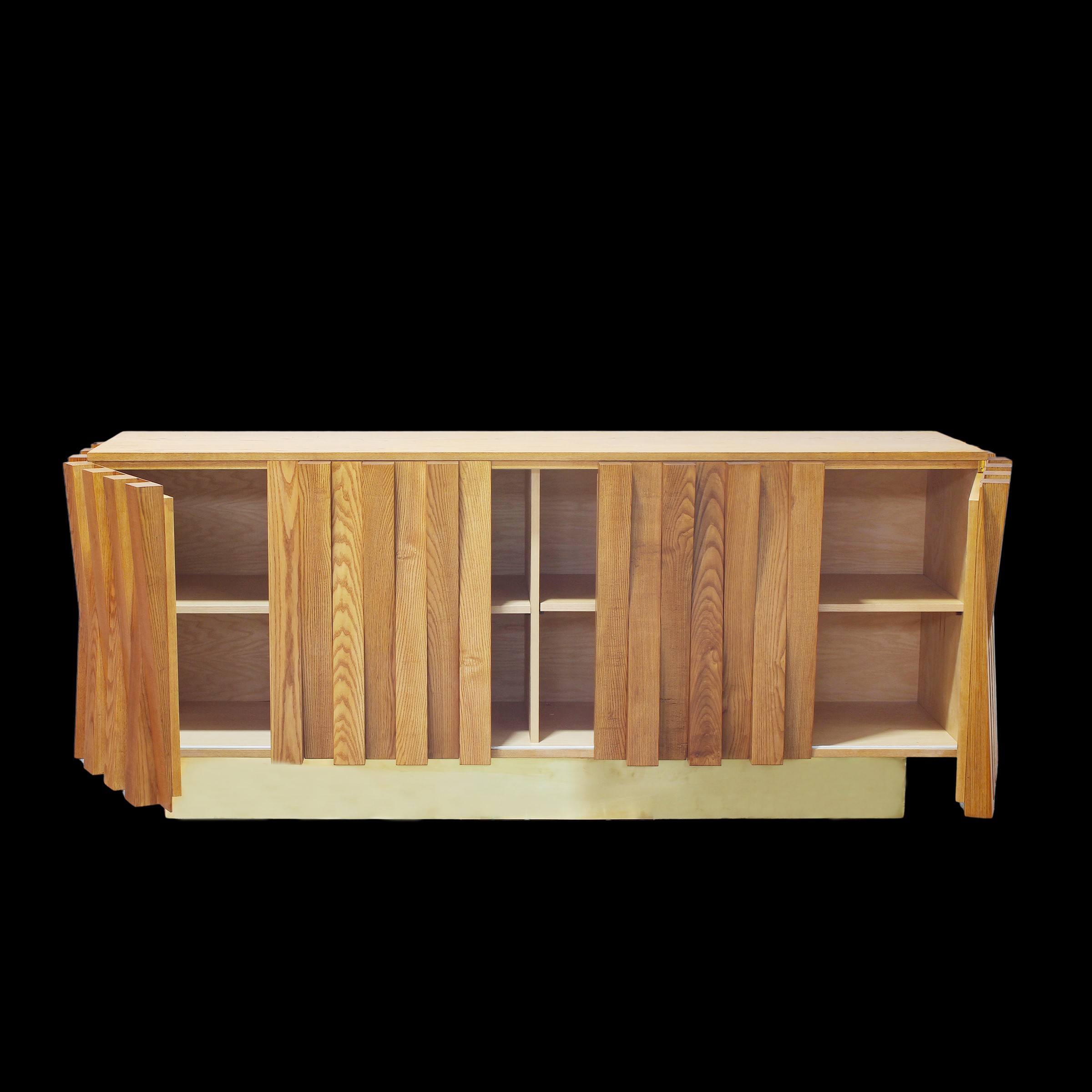 credenza in legno di frassino e ottone, fronte con due sportelli fissi e due scorrevoli
