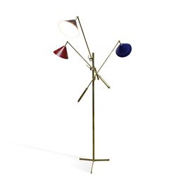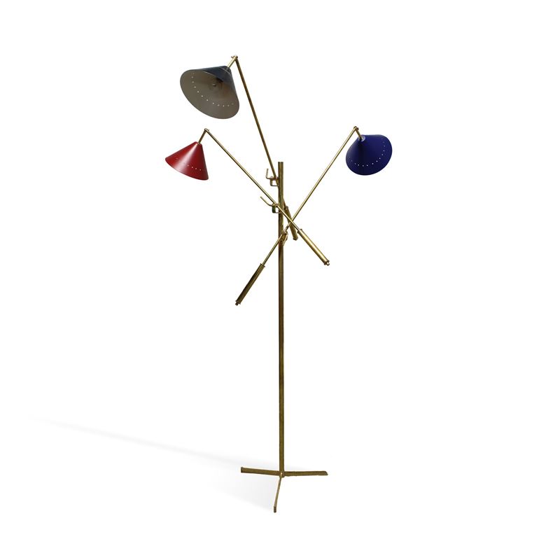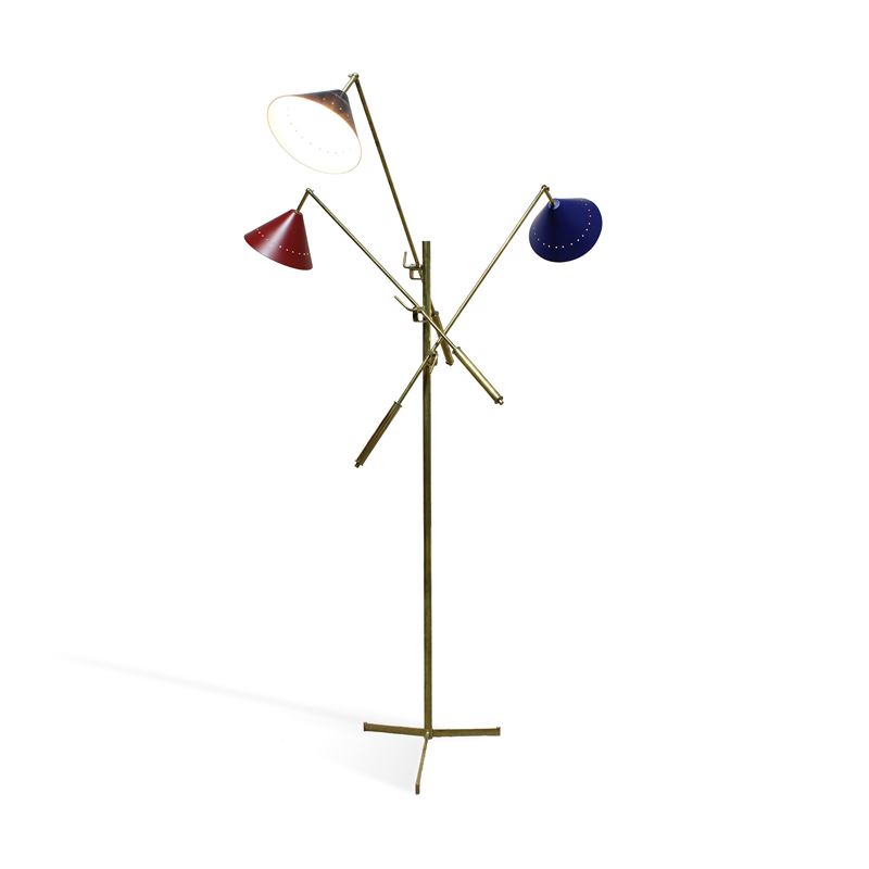 lampada da terra, struttura in ottone con paralumi in metallo di colori diversi.