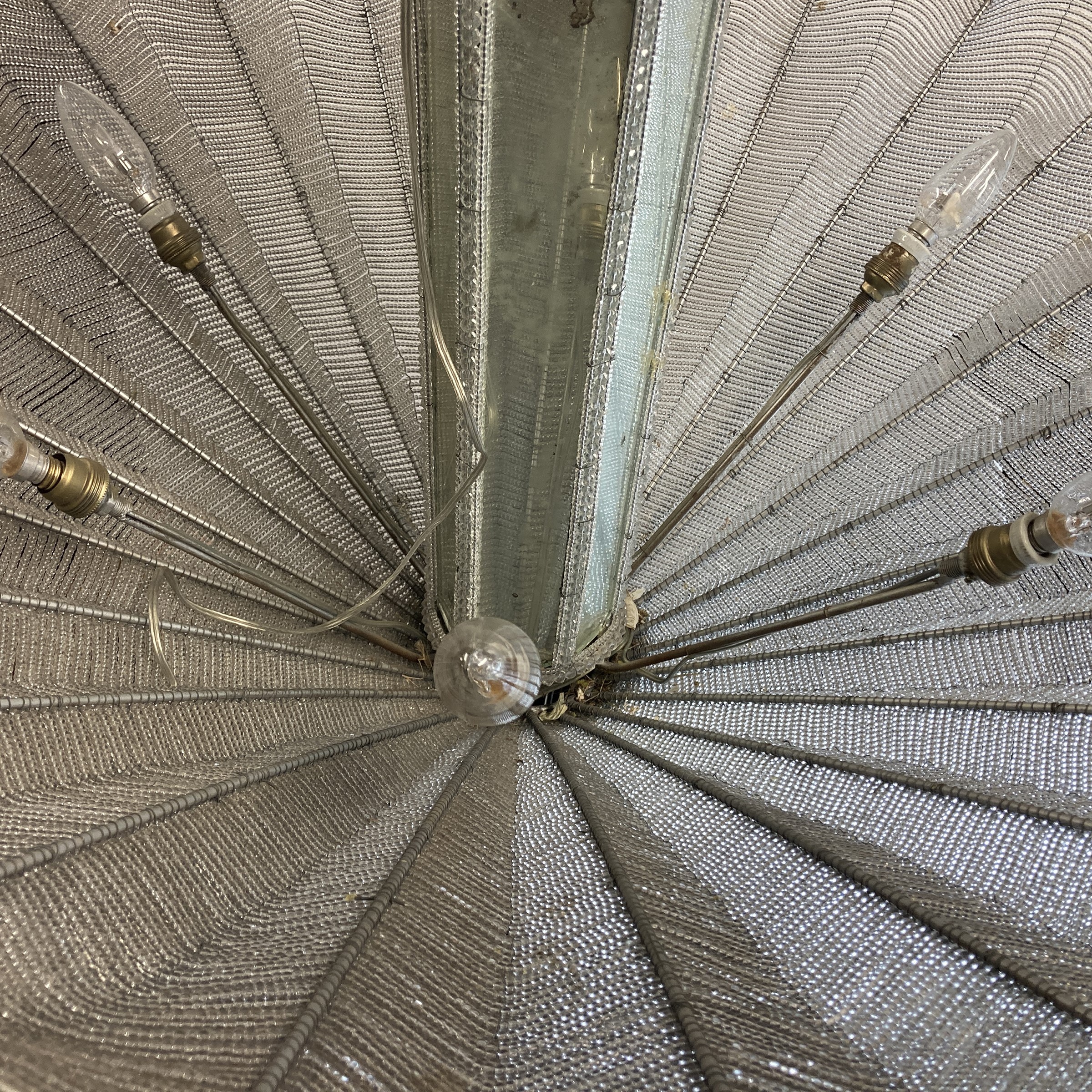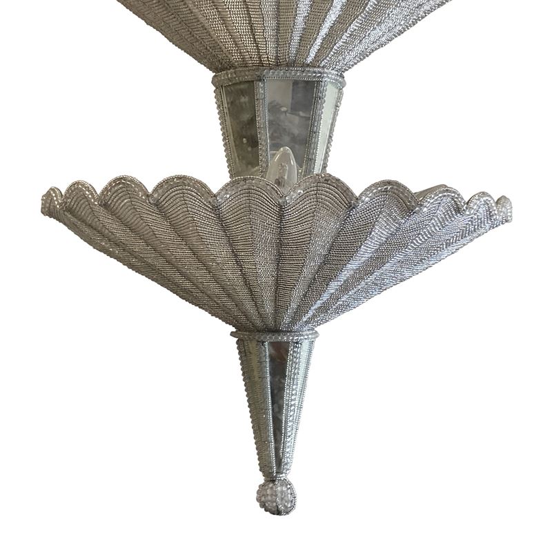 lampada a sospensione a due ventagli, struttura in ferro con perline in vetro e specchi