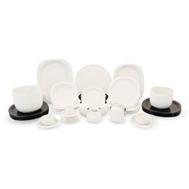 modello Suomi, composto da: 8 sottopiatti neri, 22 piatti piani, 20 piatti fondi con lievi difetti, 24 piattini da frutta, 4 piatti ovali da portata, 1 piatto circolare da portata, 12 tazze da consommé con piattini, 11 coppette da macedonia, 4 tazze da tè con piattini, 14 tazzine da caffè con piattini, 3 zuccheriere, 1 lattiera.