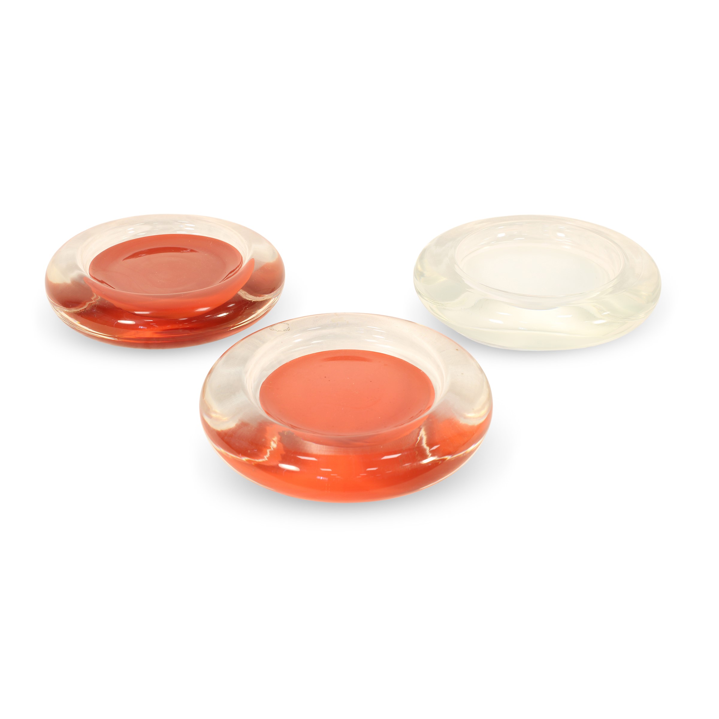 tre posacenere in vetro di Murano soffiato di colore rosso e bianco, firma a punta Venini Italia 80