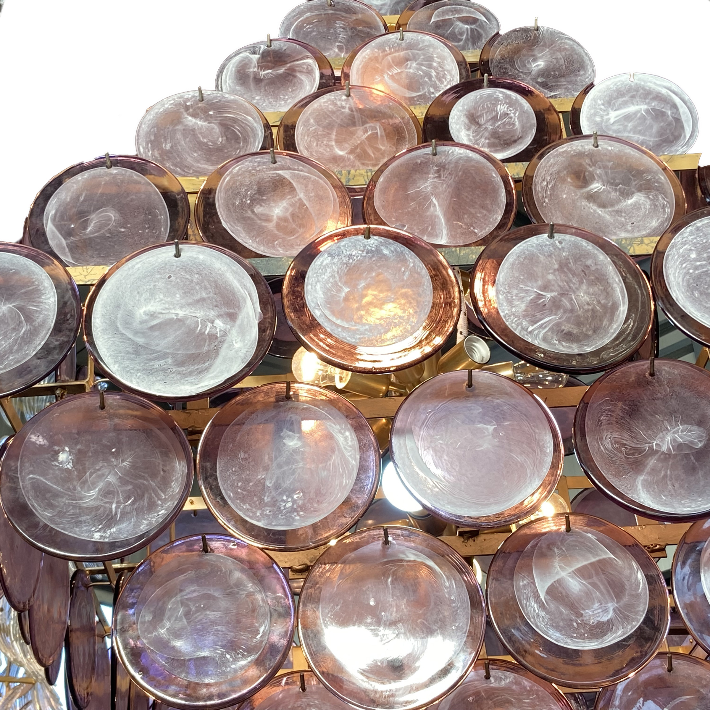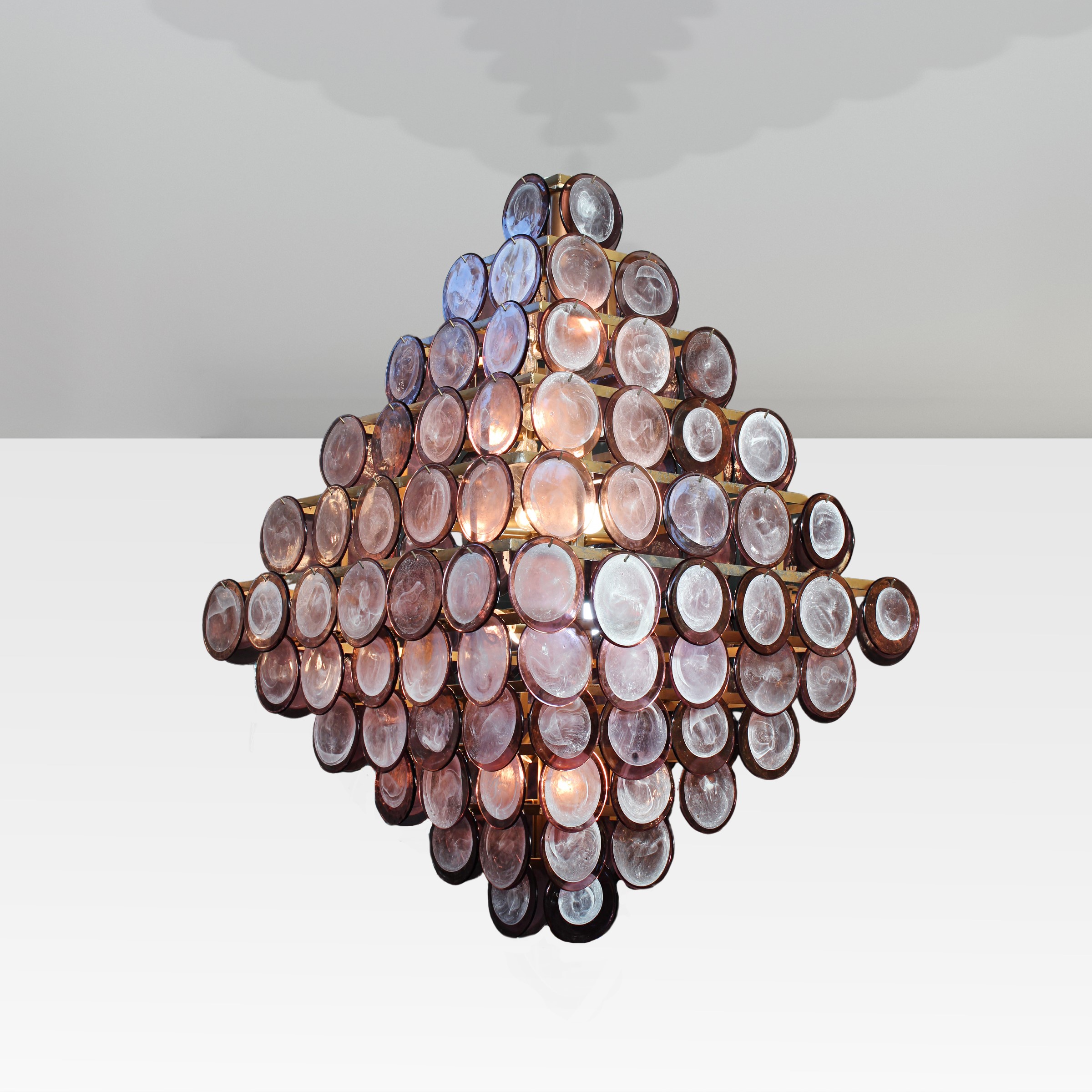 lampadario a sospensione con dischi in vetro ametista a macchia bianca, struttura in metallo dorato.
