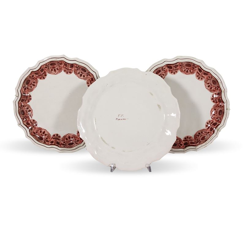 Tre piatti in ceramica smaltata., Faenza, XX sec.