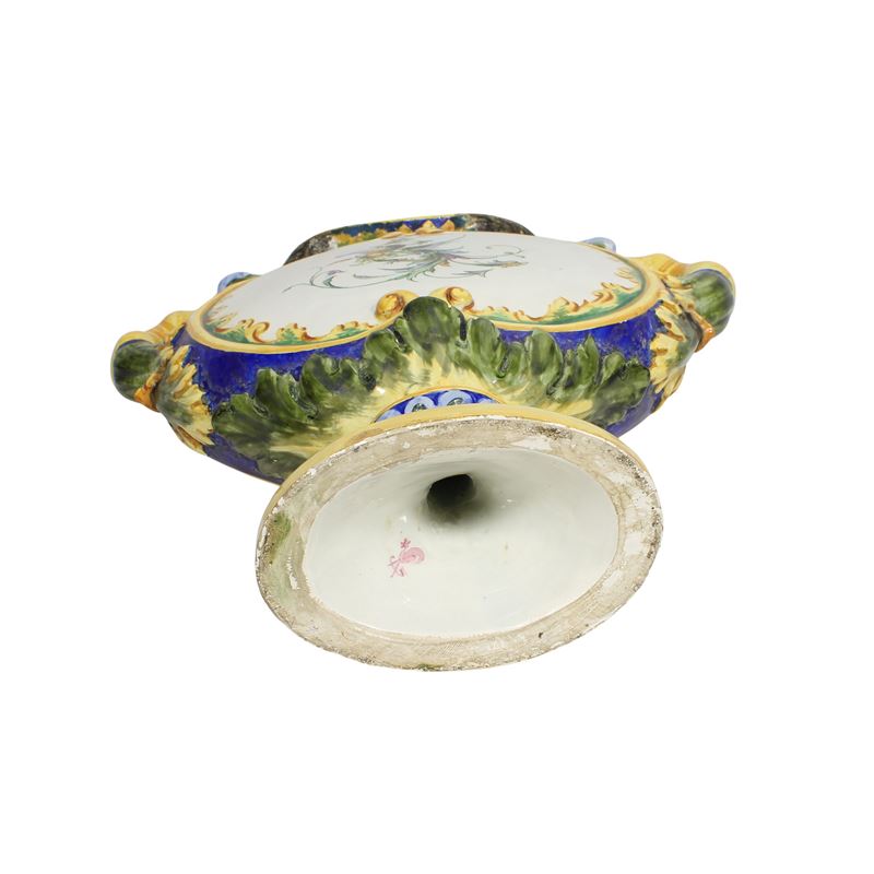 dipinta in policromia con motivi vegetali, prese laterali a foggia di figure femminili, marchio Andrea Galvani Pordenone