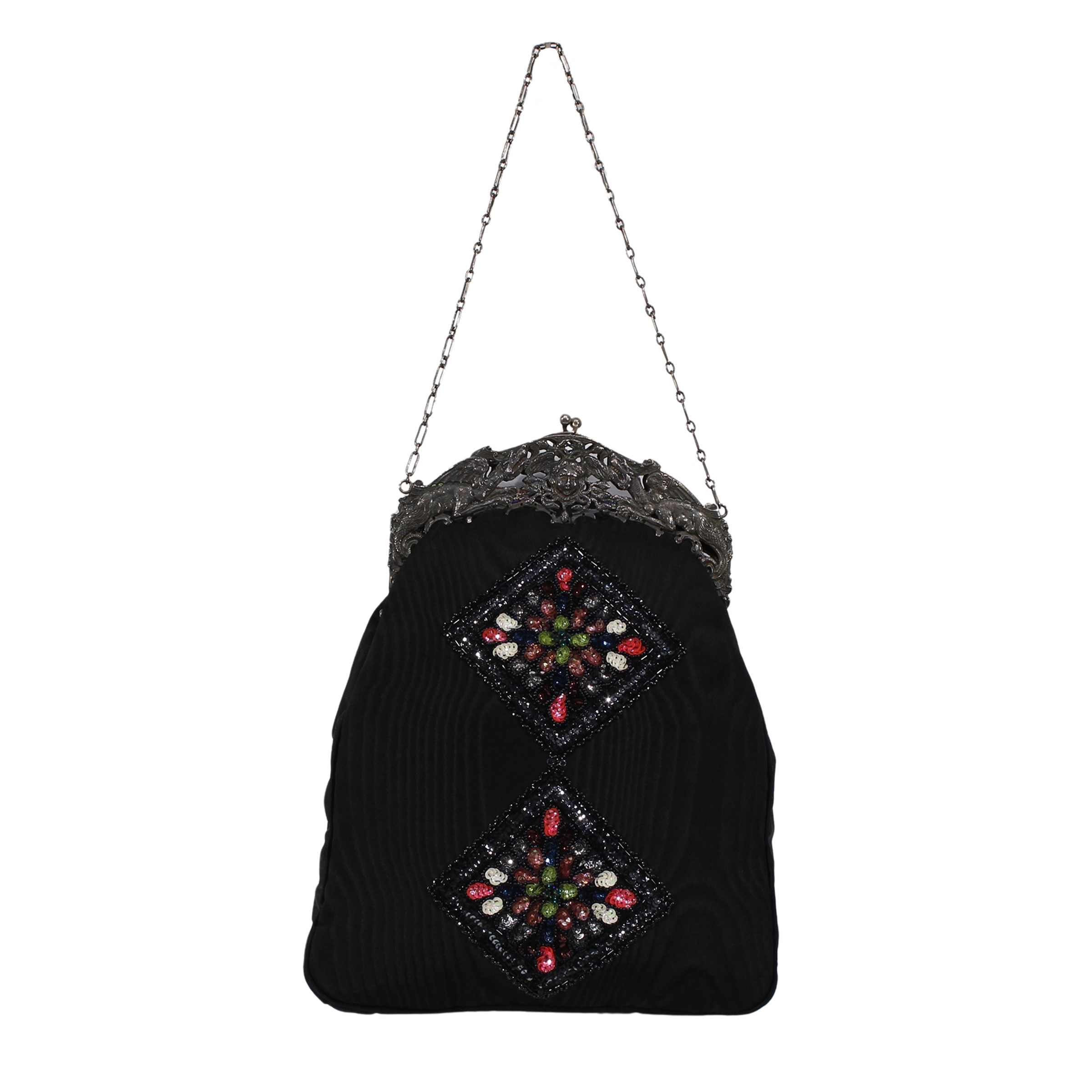 in tessuto nero arricchita con paillettes colorate, chiusura in metallo finemente lavorata con decorazioni in rilievo