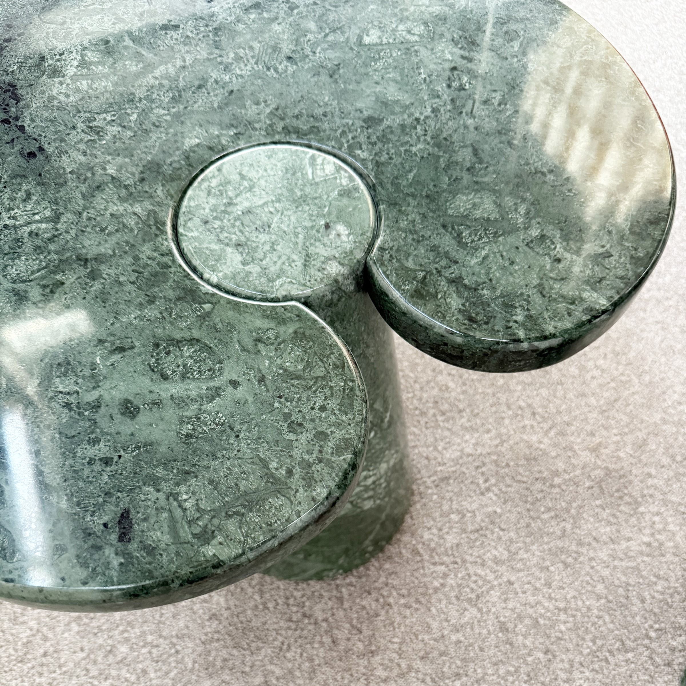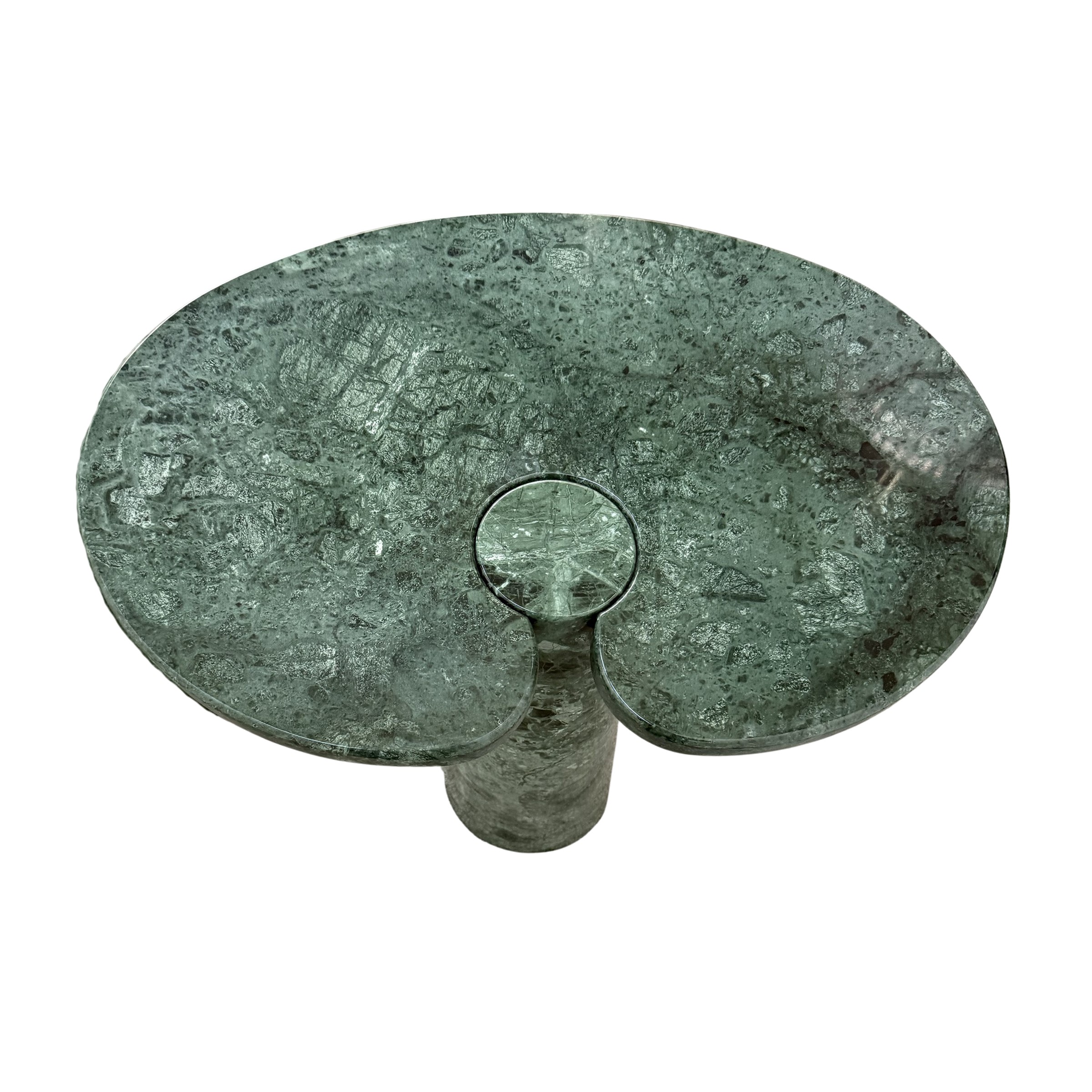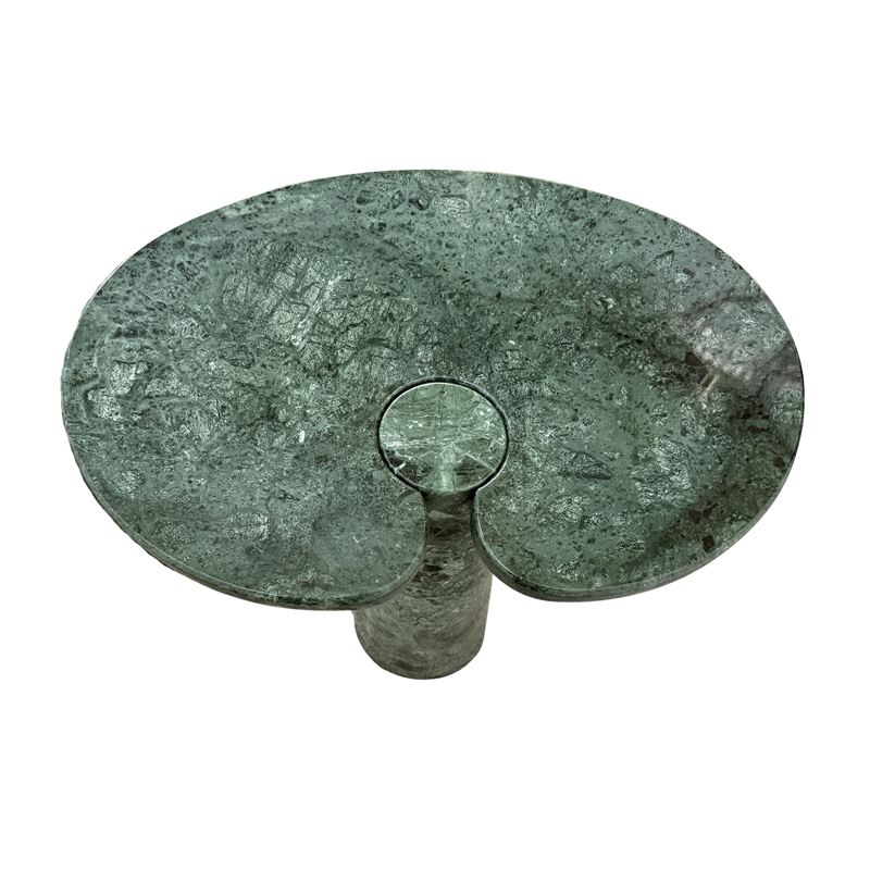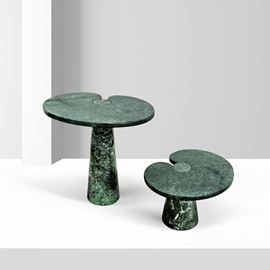 due tavolini serie Eros, in marmo verde, etichette della produzione