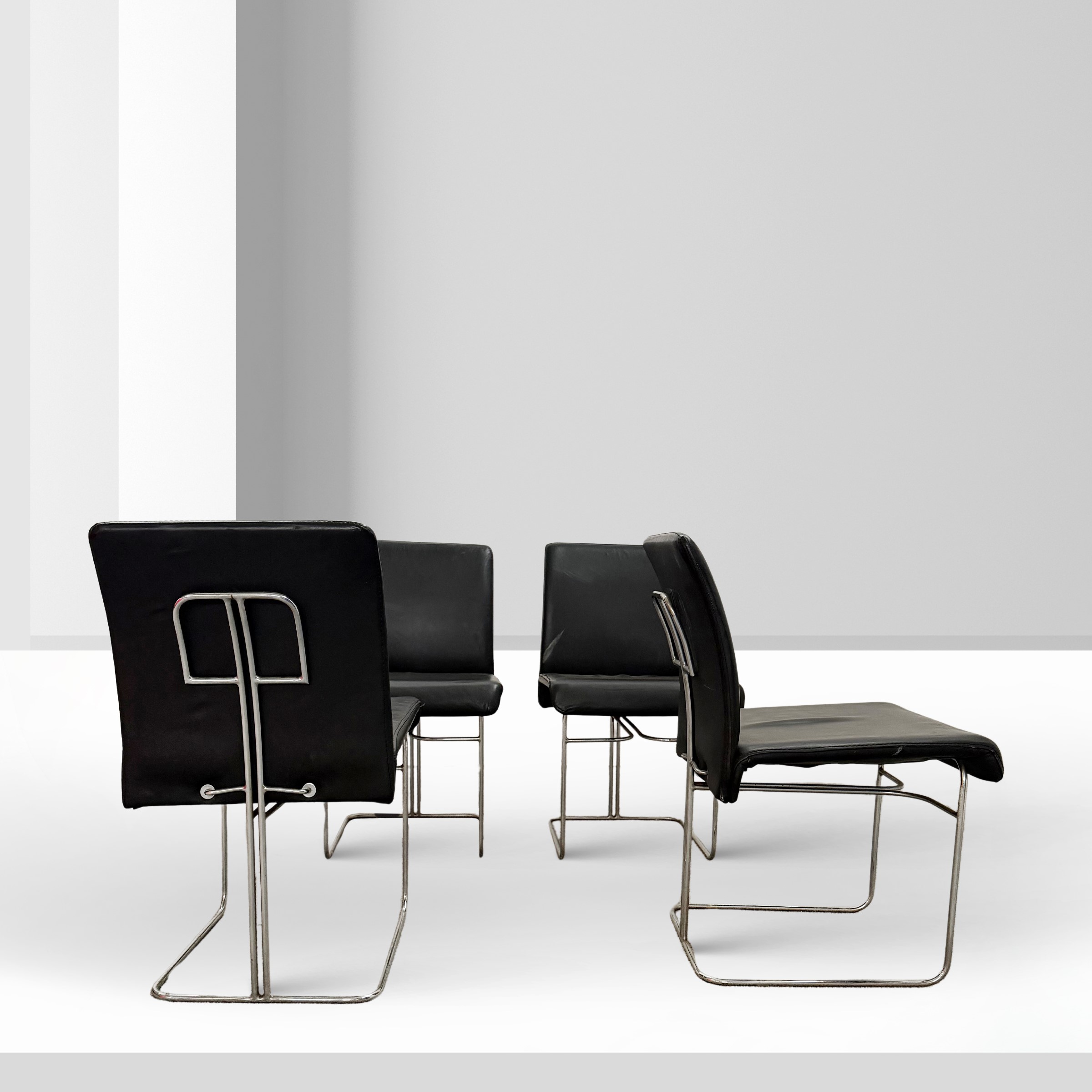 quattro sedie mod. "P.15", acciaio cromato ed ecopelle nera