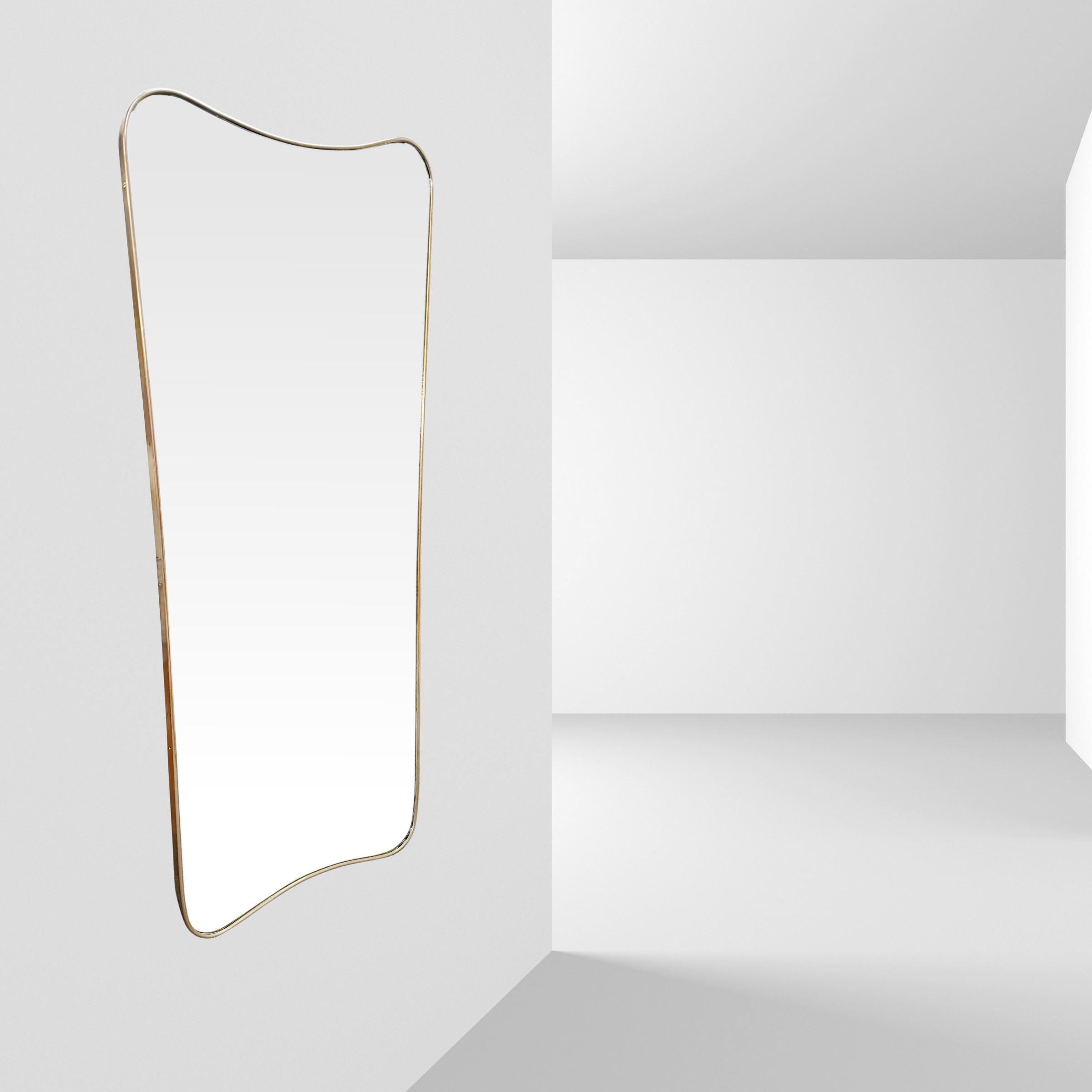 specchio da parete sagomato in ottone e vetro specchiato.