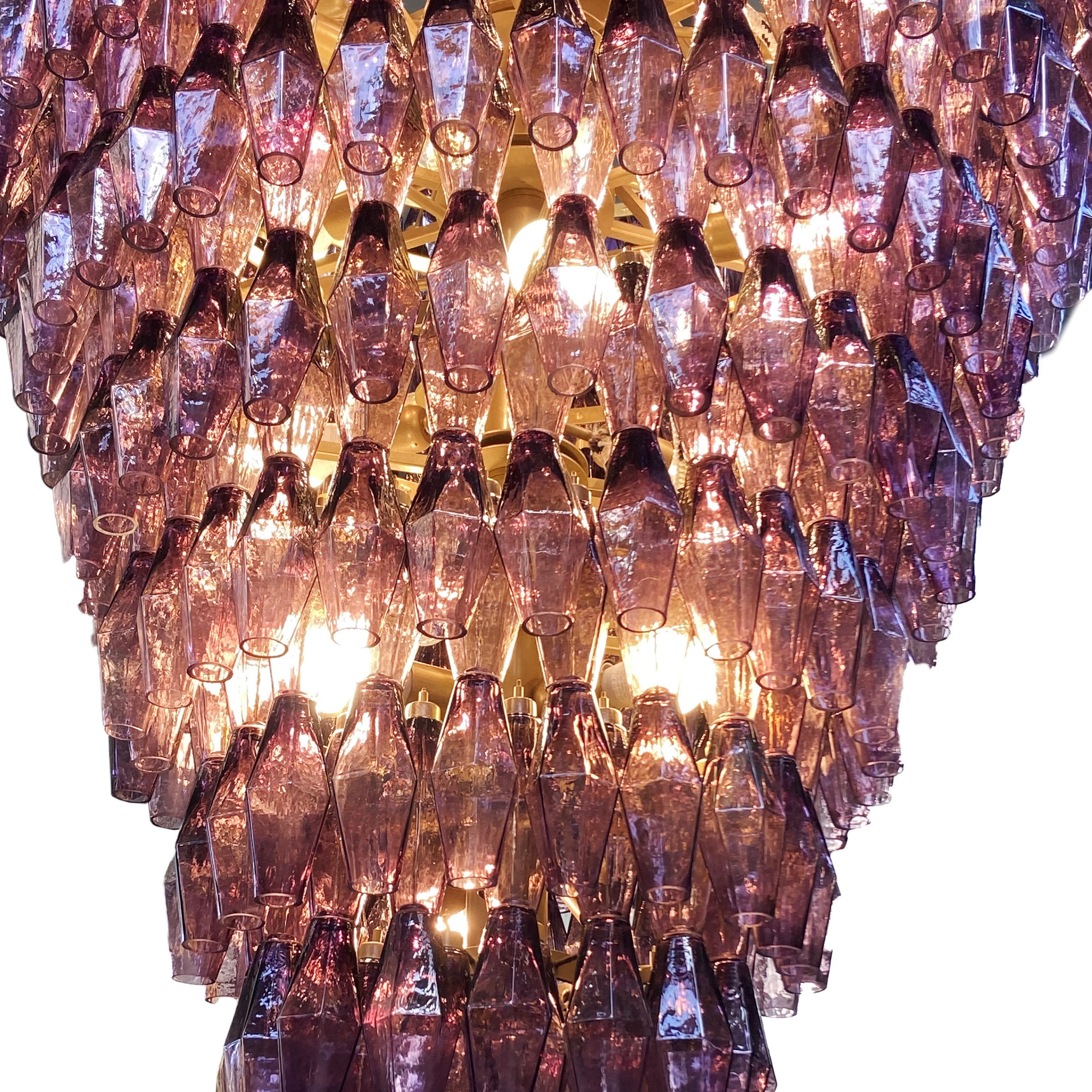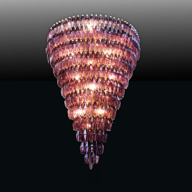 grande lampada a sospensione con poliedri in vetro ametista, struttura in metallo dorato.