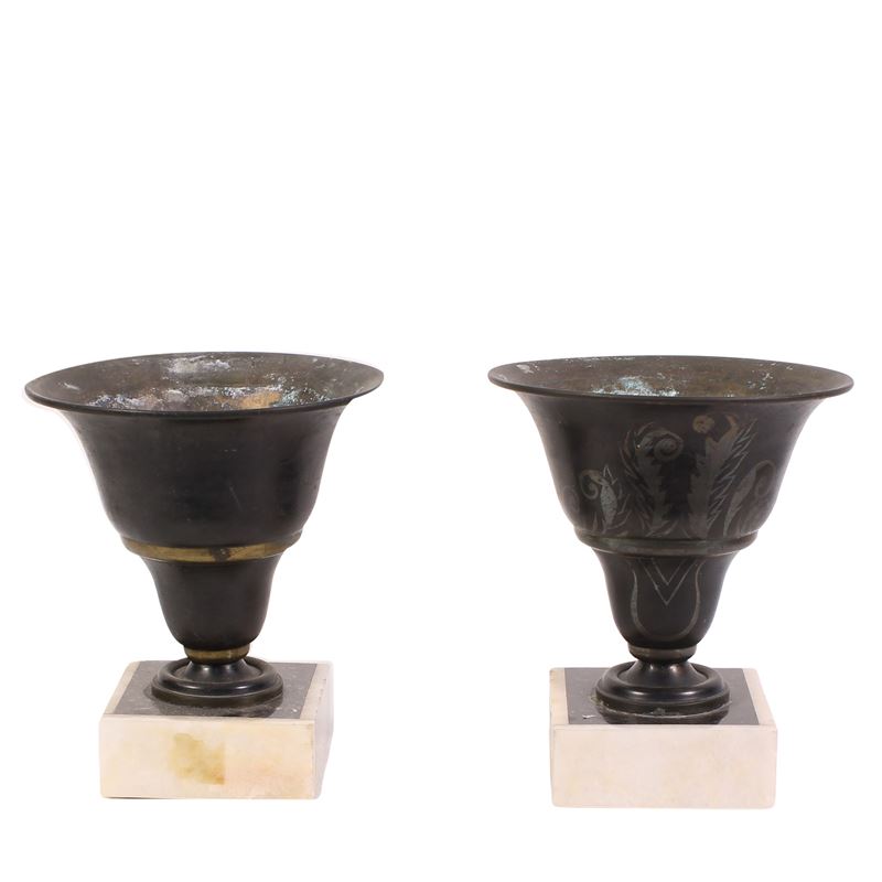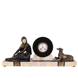 trittico in bronzo e marmo raffigurante l'amore fedele nel tempo, composto da: un orologio con due sculture raffiguranti rispettivamente una figura femminile ed un levriero e due vasi in bronzo, lievi difetti
