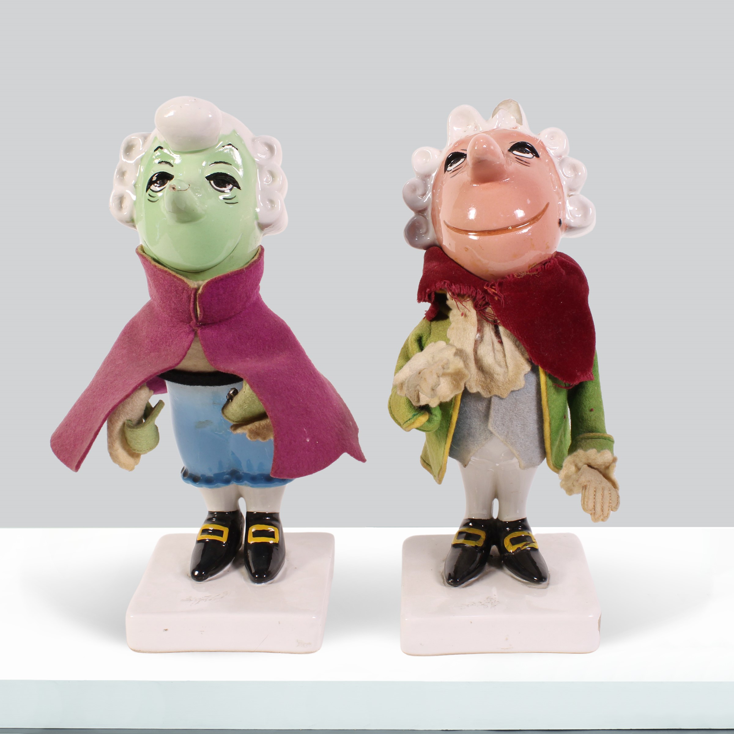 coppia di sculture in porcellana raffiguranti due personaggi di fantasia, firma della produzione.