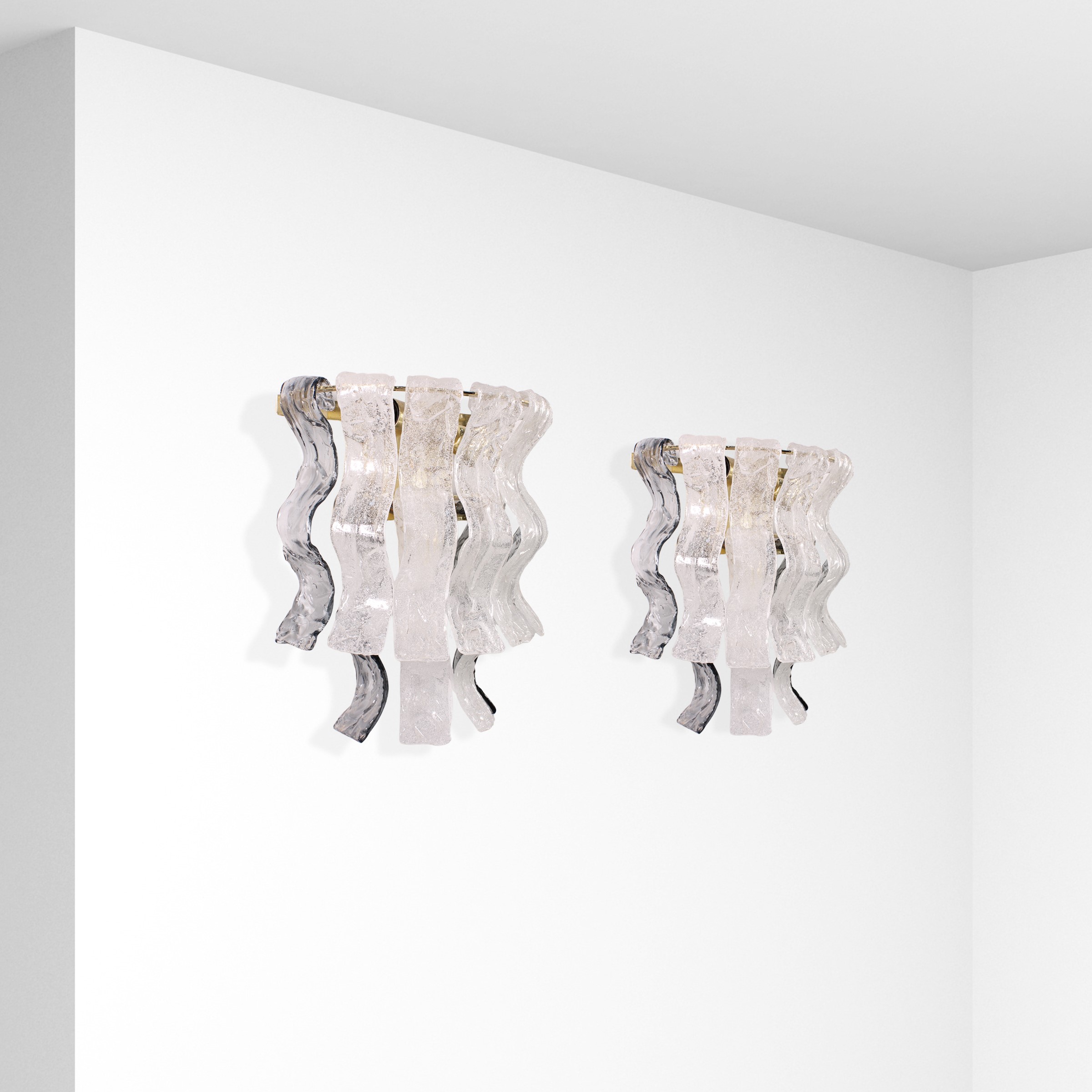 coppia di appliques in vetro di Murano bianco e fumé con effetto corteccia e metallo.