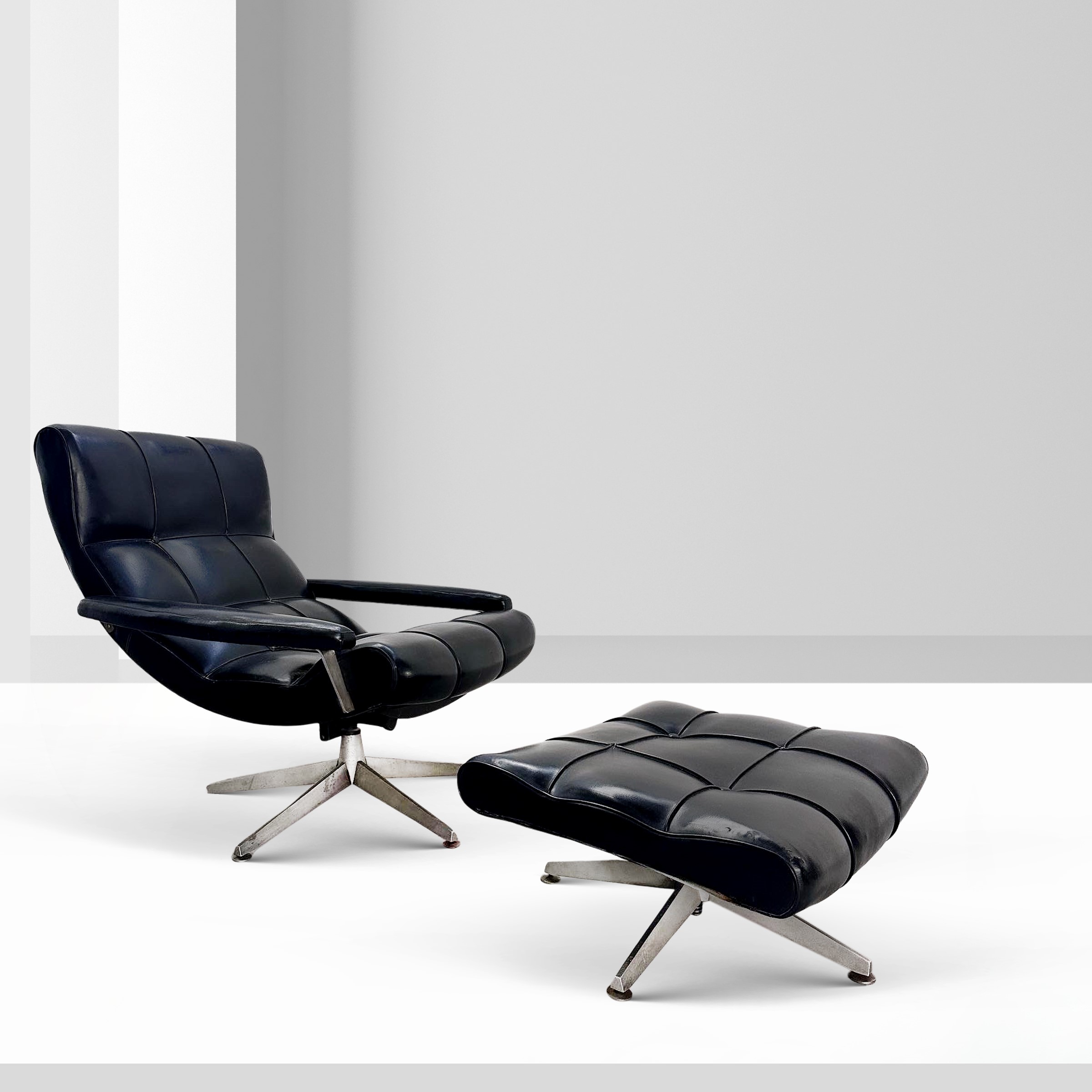 poltrona con pouf, pelle nera trapuntata e base girevole in metallo.