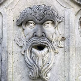 vasca baccellata poggiante su base decorata con volute, mensola centrata da un mascherone grottesco