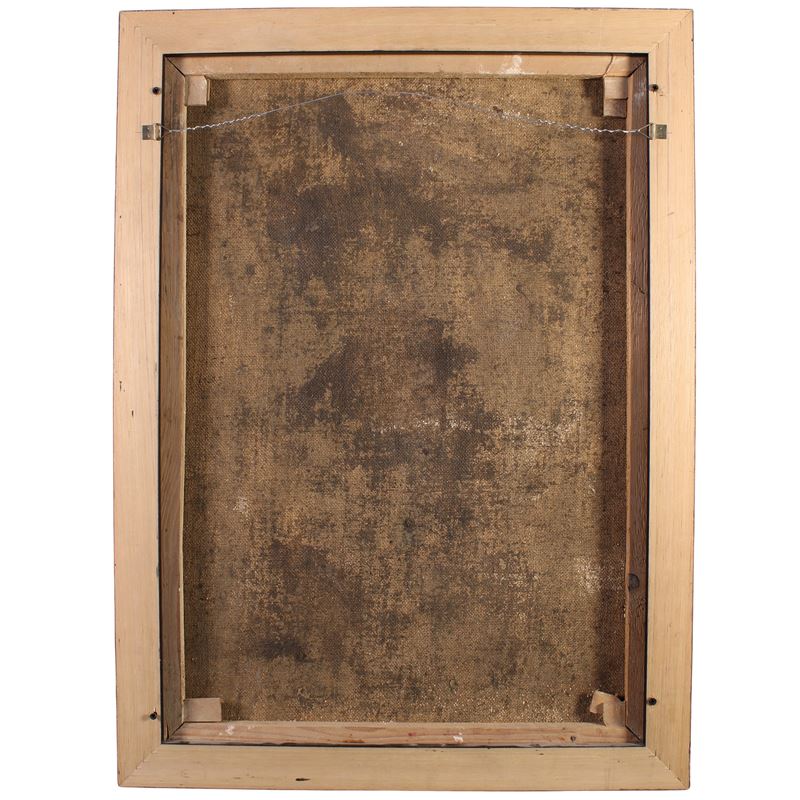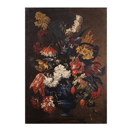 "Fiori in un vaso azzurro istoriato", olio su tela.