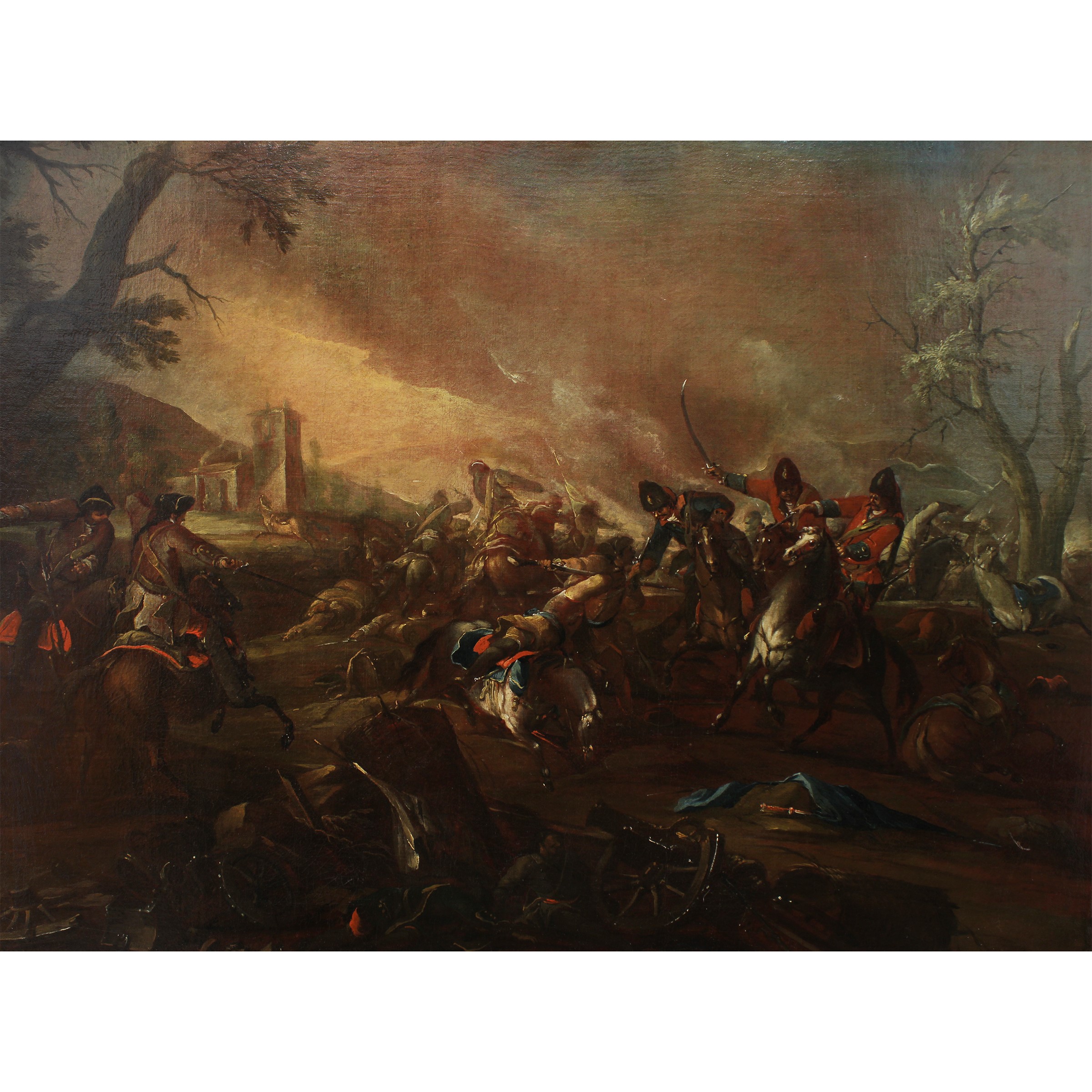"Scena di battaglia", olio su tela, entro cornice in legno dorato.