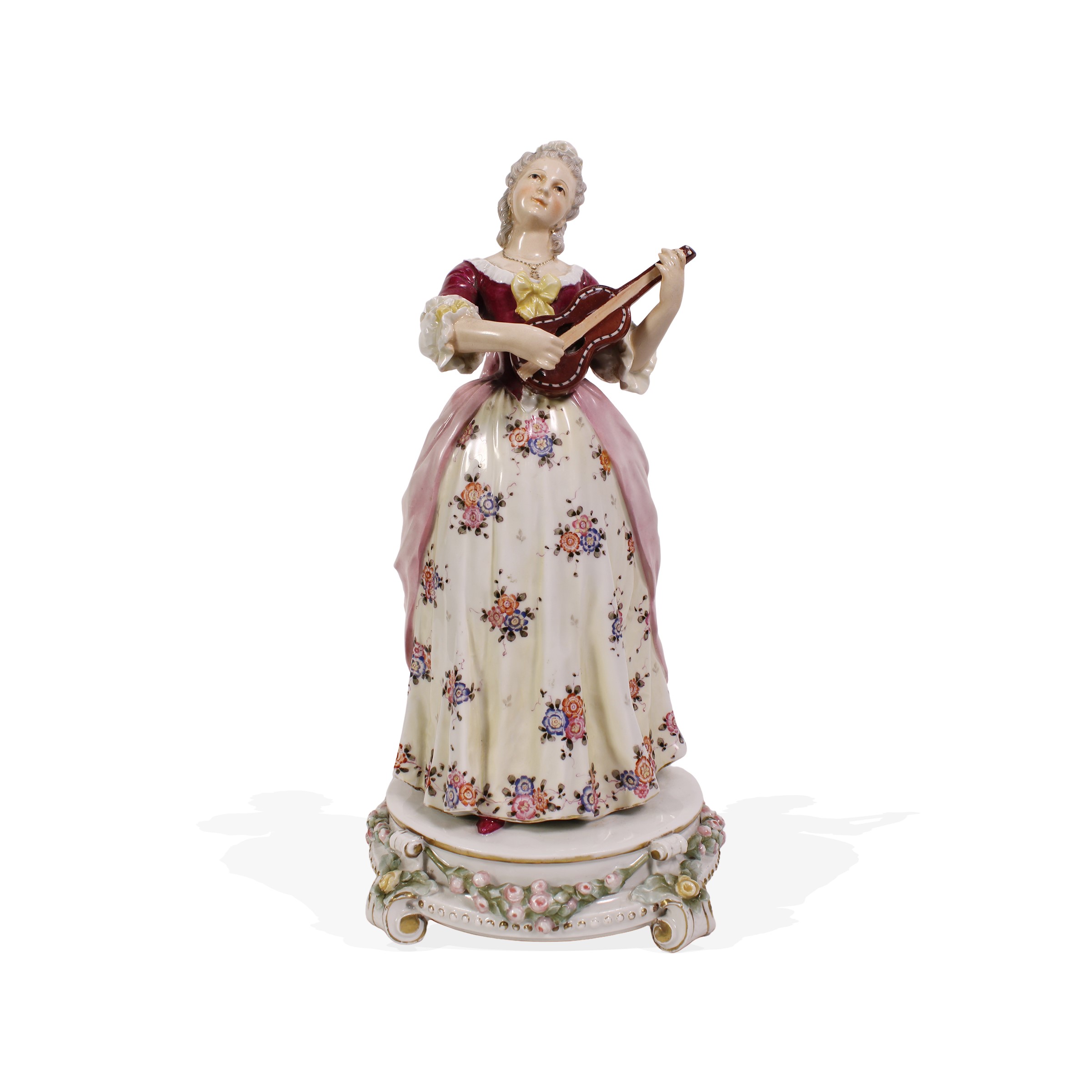 scultura in ceramica smaltata raffigurante una donna che suona un violino.