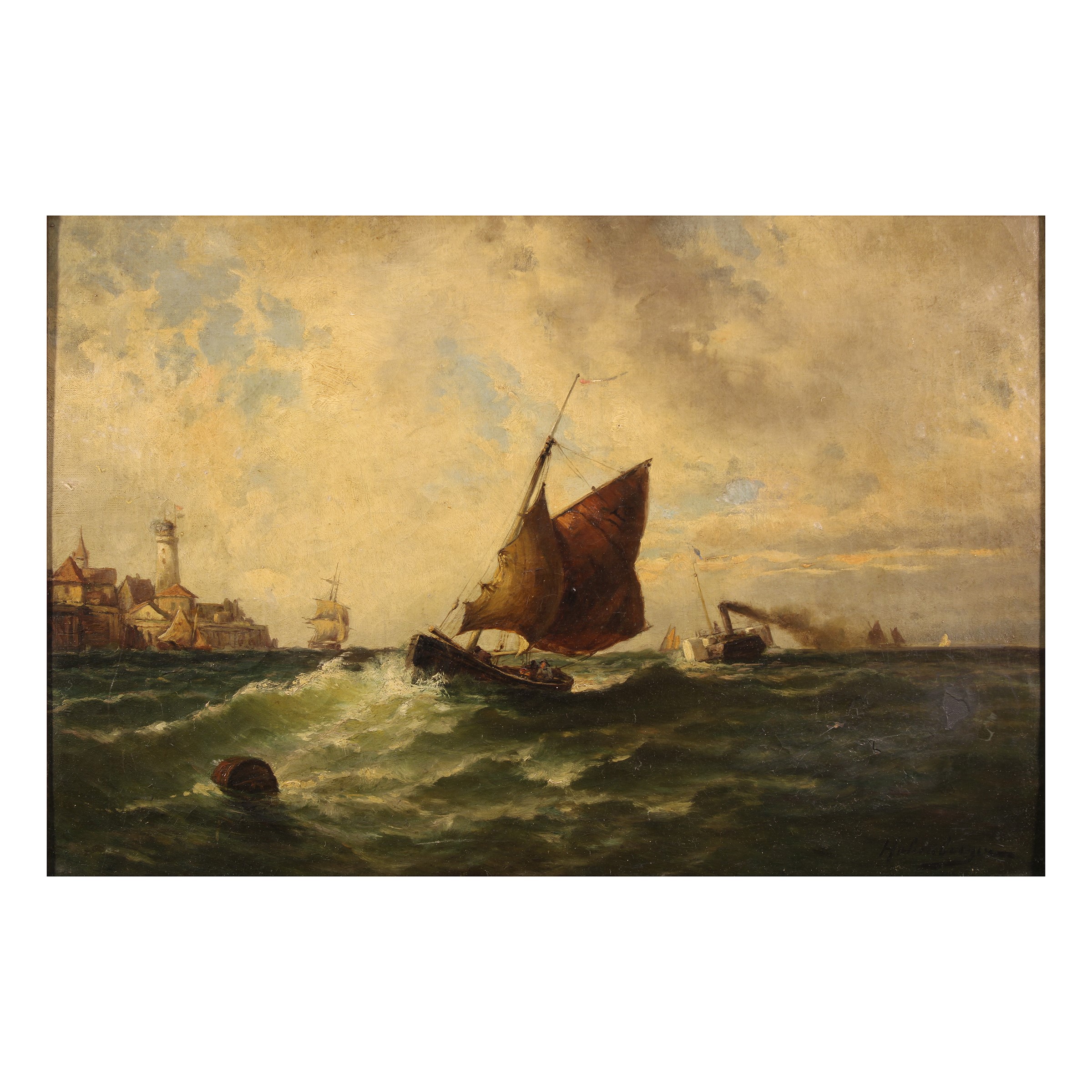 "Veduta marina con mare mosso e barche", olio su tela, firmato in basso a destra.